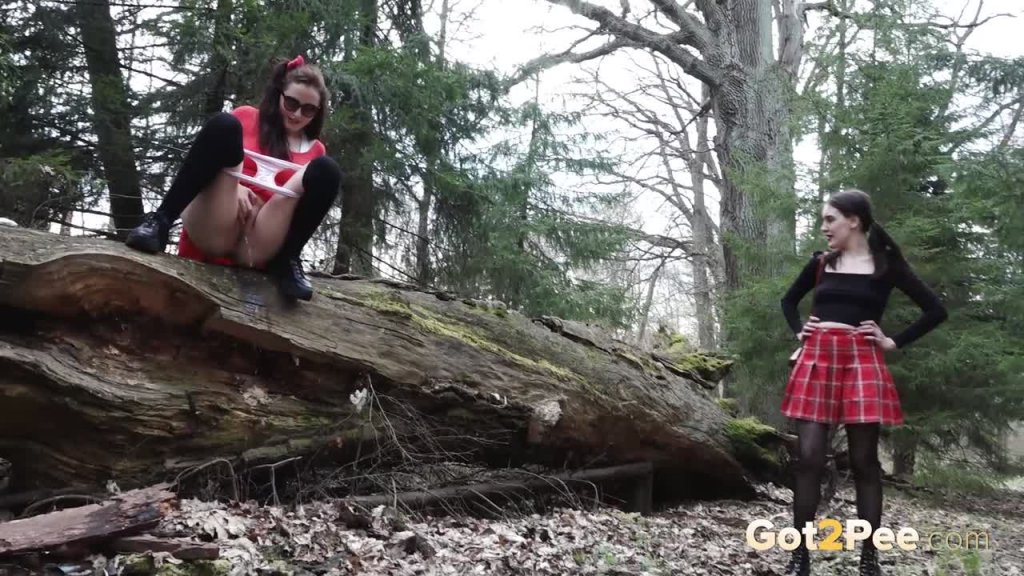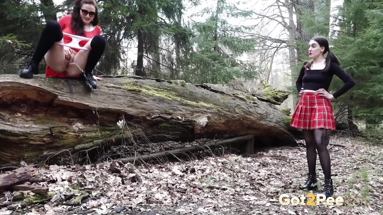 Dark haired best friends are walking in the suburbs after school when one of them decides she needs to piss. She playfully climbs up on top of a fallen tree and squatting to pee, sprays her golden piss over the edge while her friend watches her relieve her piss desperation. Her friend hands her some tissues so that she can wipe clean and we capture this public piss on Got2Pee.