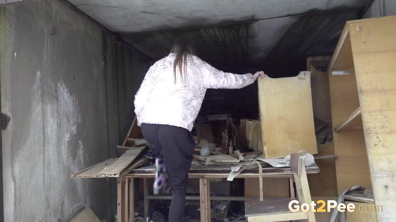 Our newest public pissing scene features a hot brunette who walks in the suburbs and stumbles across a row of lockups. With one completely open, this hottie climbs inside onto a wooden table and looks around before pulling down her leggings. She crouches down with her ass on show as she relieves her pee desperation and lets powerful bursts of piss flow down onto the tabletop!