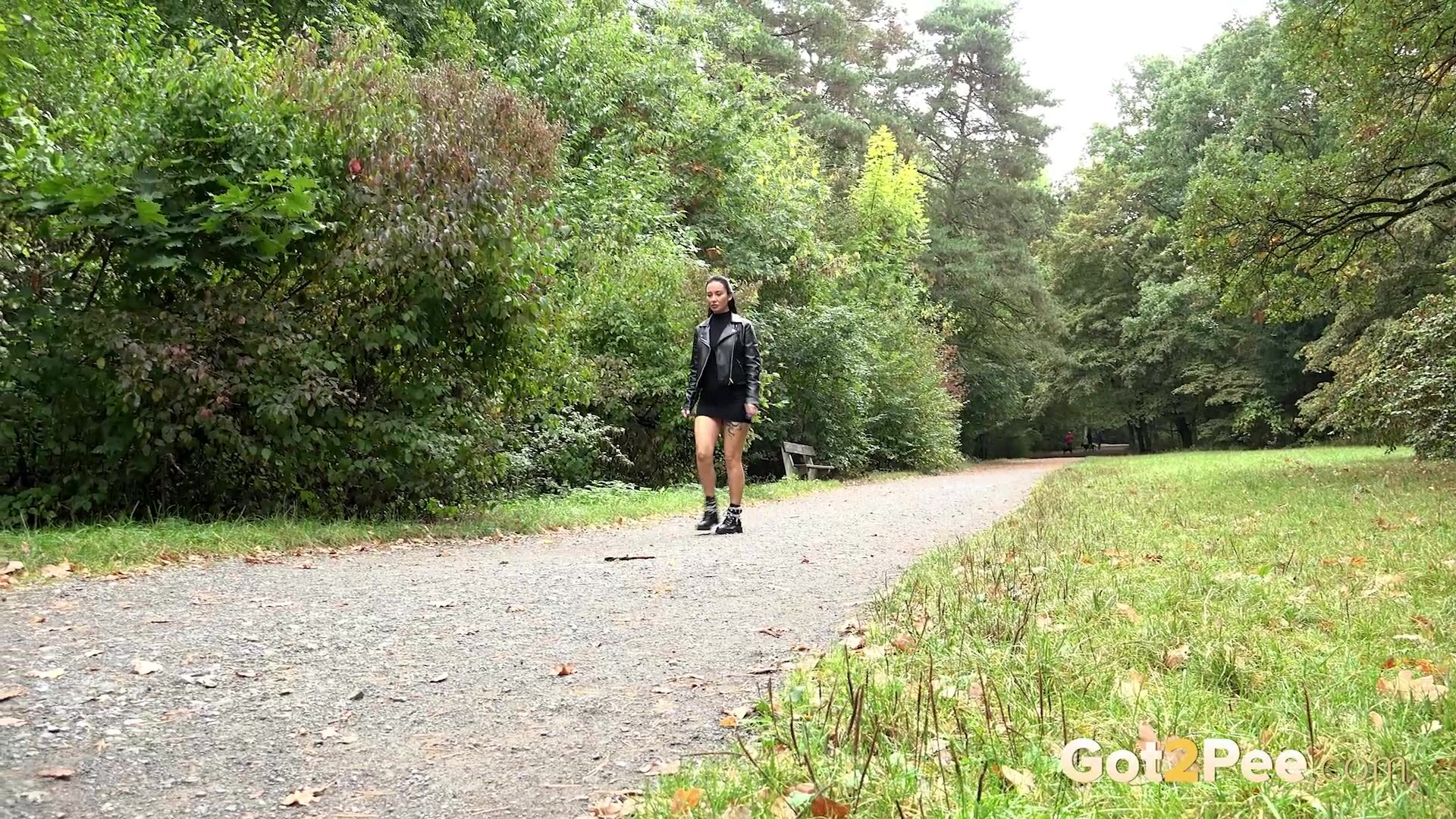 Our newest Got2Pee pissing porn scene features a hot brunette who struts her way down a public path. She stops at a wooden bench and climbs on top of it before squatting to pee! As she holds onto the back of the bench, this naughty girl sprays her stream down over the ground and is so immersed in peeing that she slips her foot!