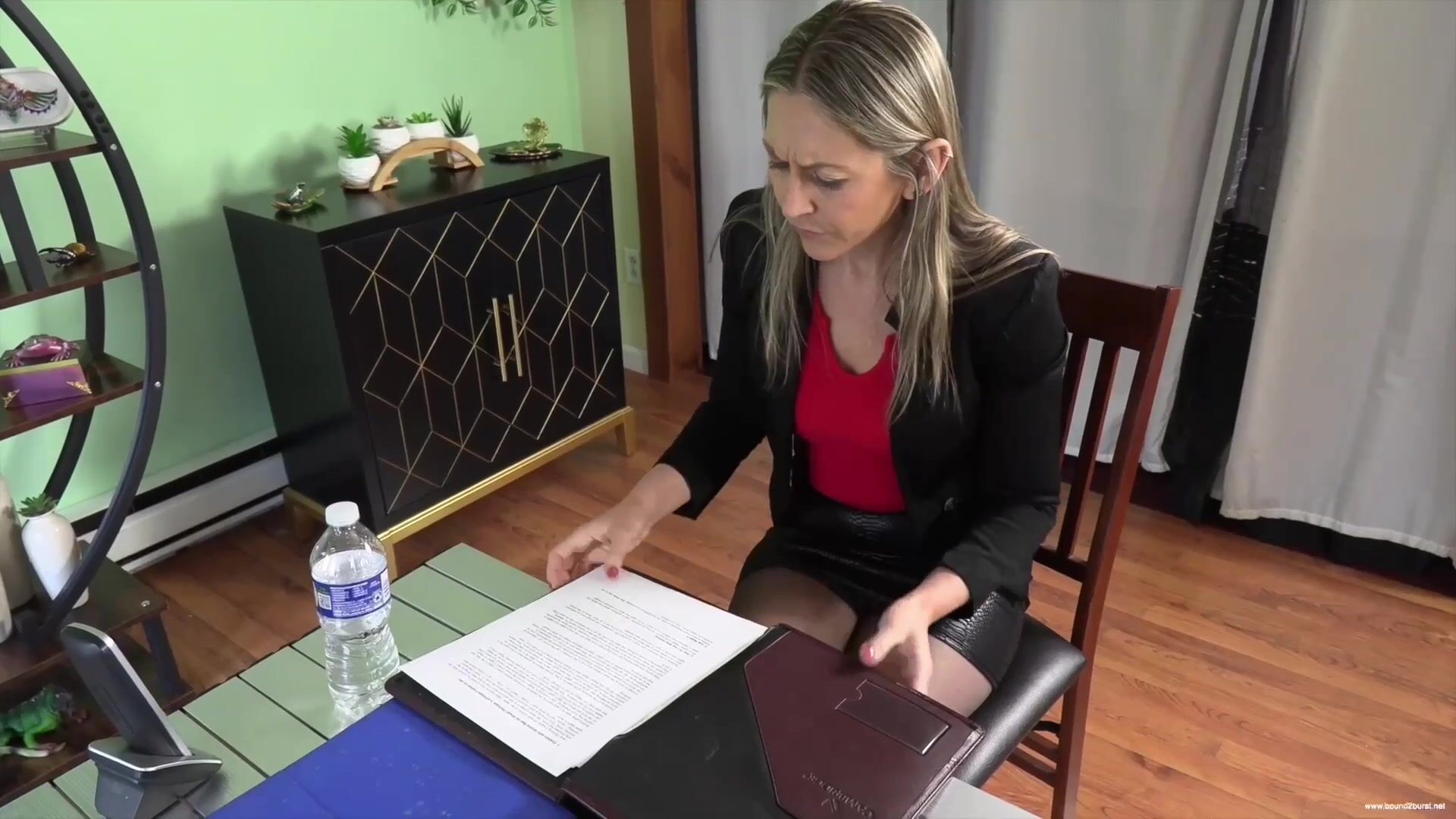 Sinthia has just started a new job with a small company. Because work on the building is behind schedule, she has to make do with a temporary office, with no nearby facilities. She is also having a very busy day because the boss needs a report finished and asks her to work through her lunch break. Putting off a visit to the bathroom, Sinthia gets herself desperate to pee. She makes several attempts to use the bathroom, despite mounting pressure from the boss who has brought the deadline forward for delivery his report. Finally, Sinthia can't hold it any longer and runs to the bathroom, only to find it occupied. While squirming outside the door in a desperate effort to hold on another few minutes, she loses control and wets herself. Not a very auspicious start to her new position.