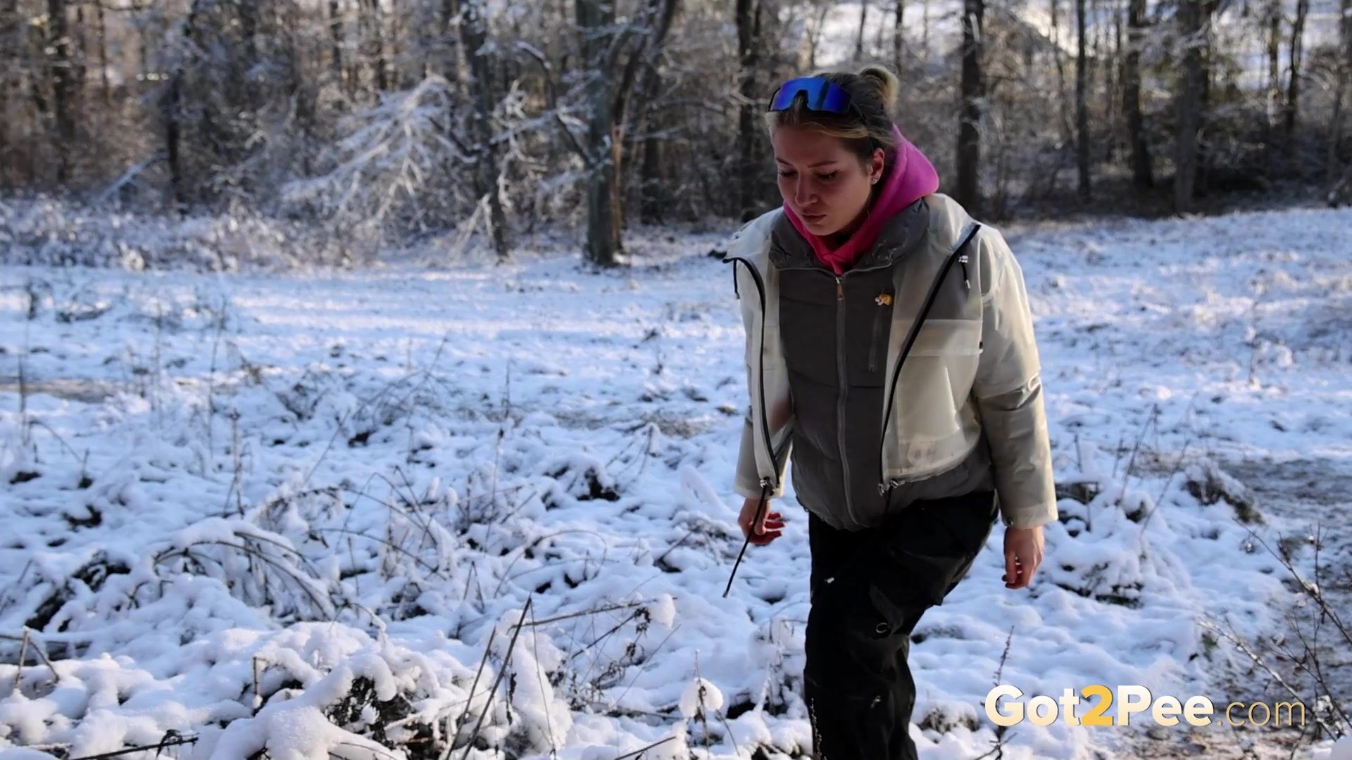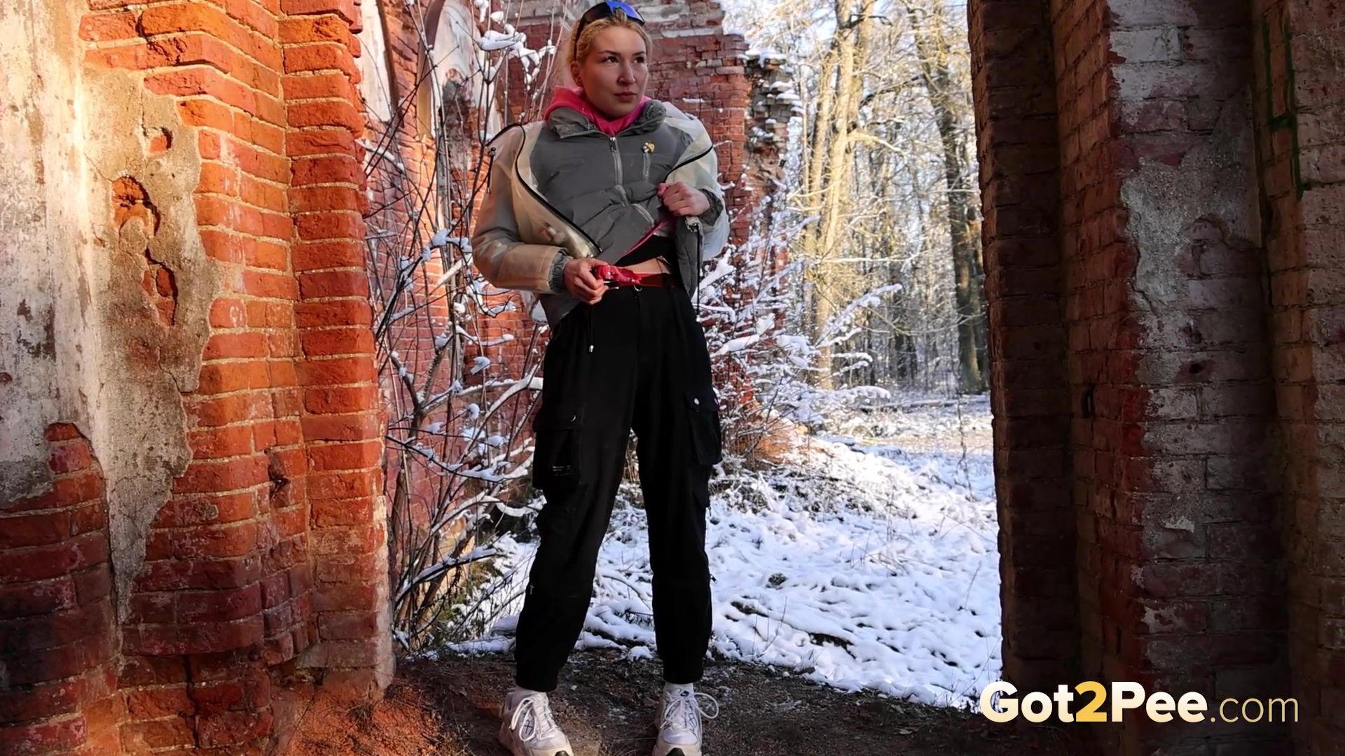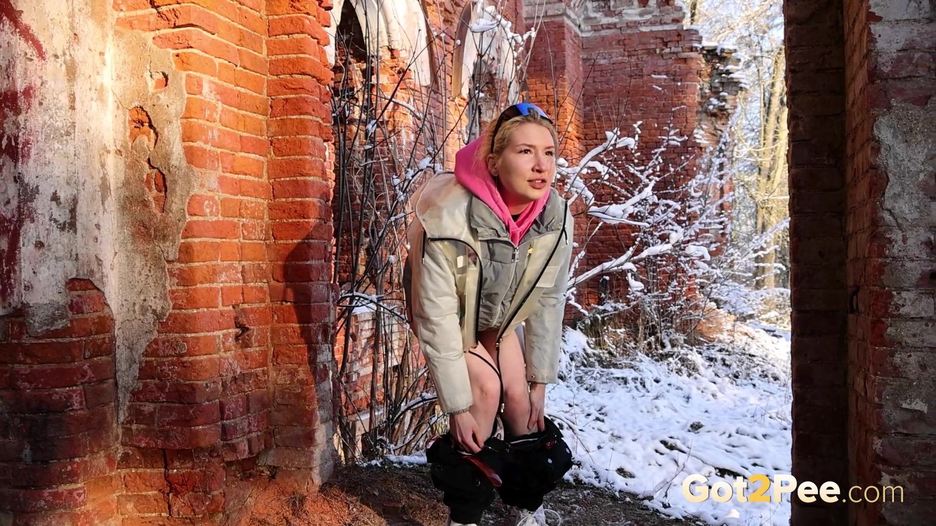 Today on Got2Pee, a European babe walks through the snow looking for the perfect spot to relieve her piss desperation. She finds an abandoned structure and stops in an archway before pulling down her cargo pants. Squatting to pee, this hot blonde sprays her golden juices over the ground.