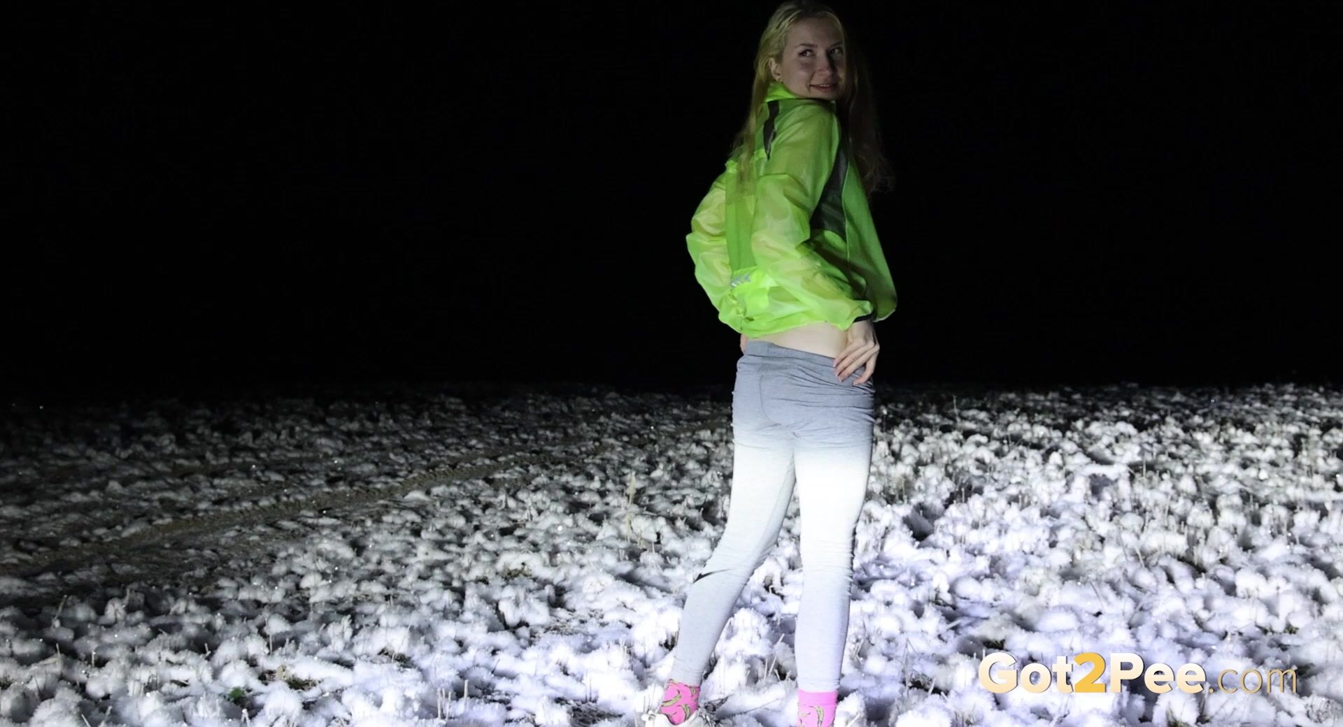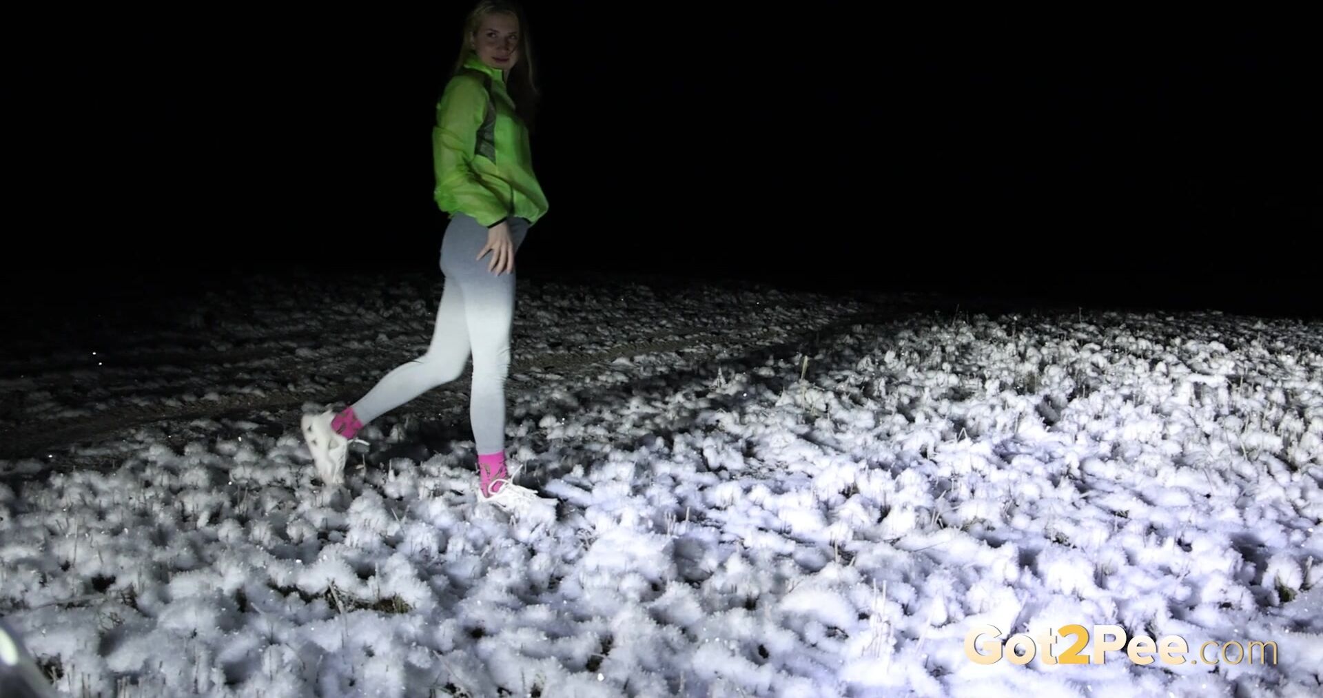 We've got a night filmed update for our latest Got2Pee public pissing porn movie as a cute European dresses for a night run and heads out in the snow. The headlights of our car light up the scene s she pulls down her leggings seductively and gets filmed bending over to pee! This hottie crouches with her ass in full view as she lets her piss stream onto the ground.