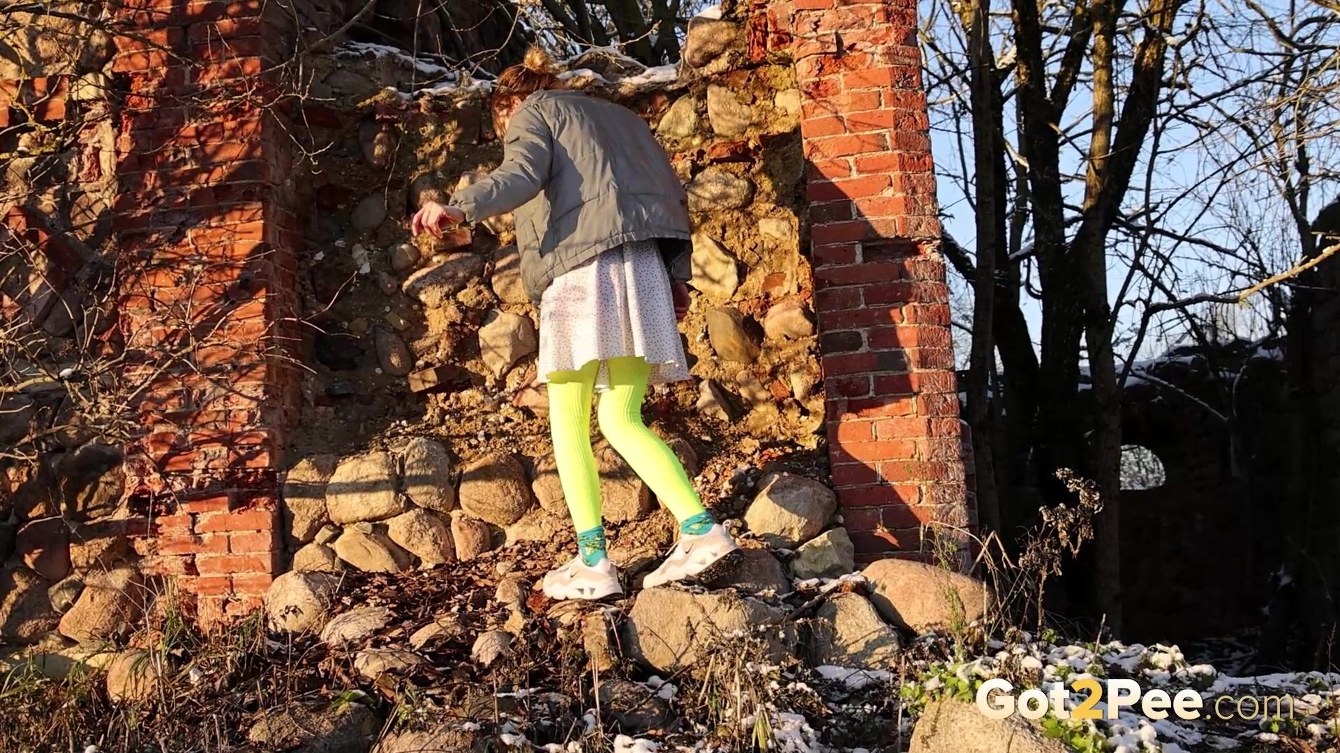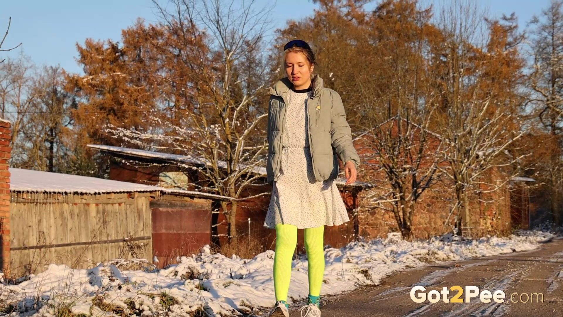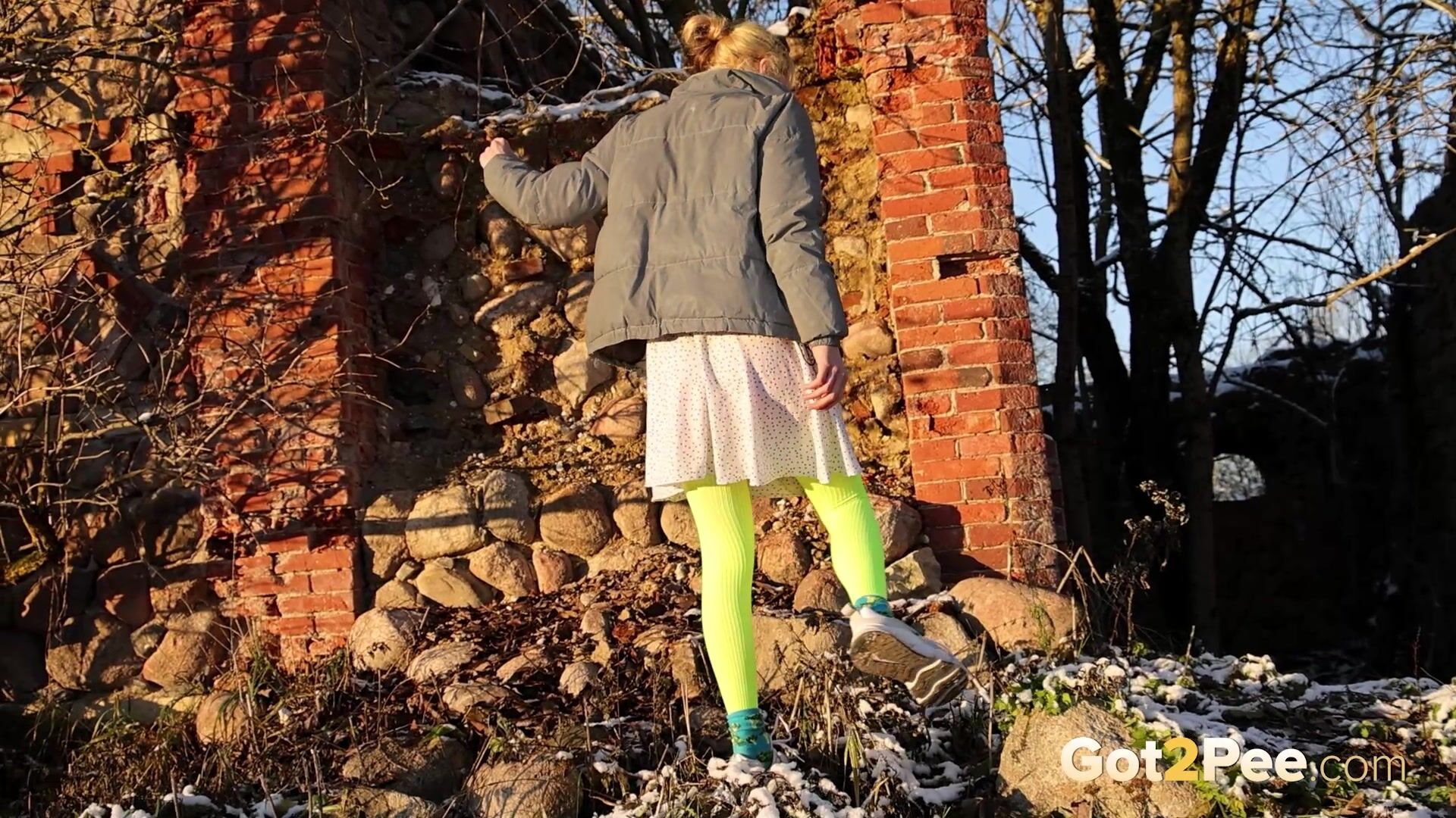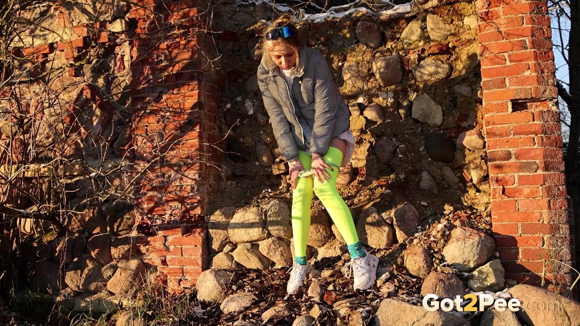 On a cold icy day a cute European walks along a road until she finds some ruins. She stops and looks around before she decides to relieve her piss desperation right there and then. After some slight hesitation, this babe pulls down her panties and is filmed squatting to pee in her neon stockings! Watch this blonde pissing all over the rubble below.