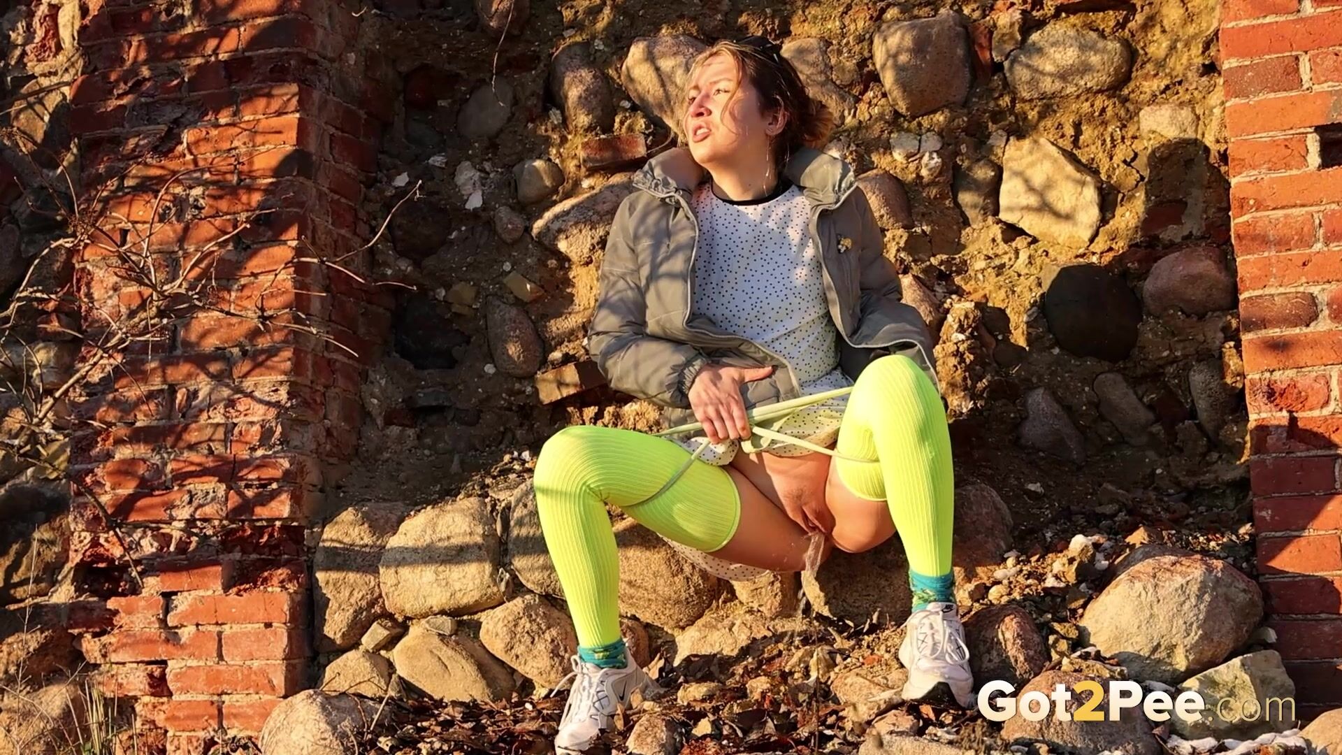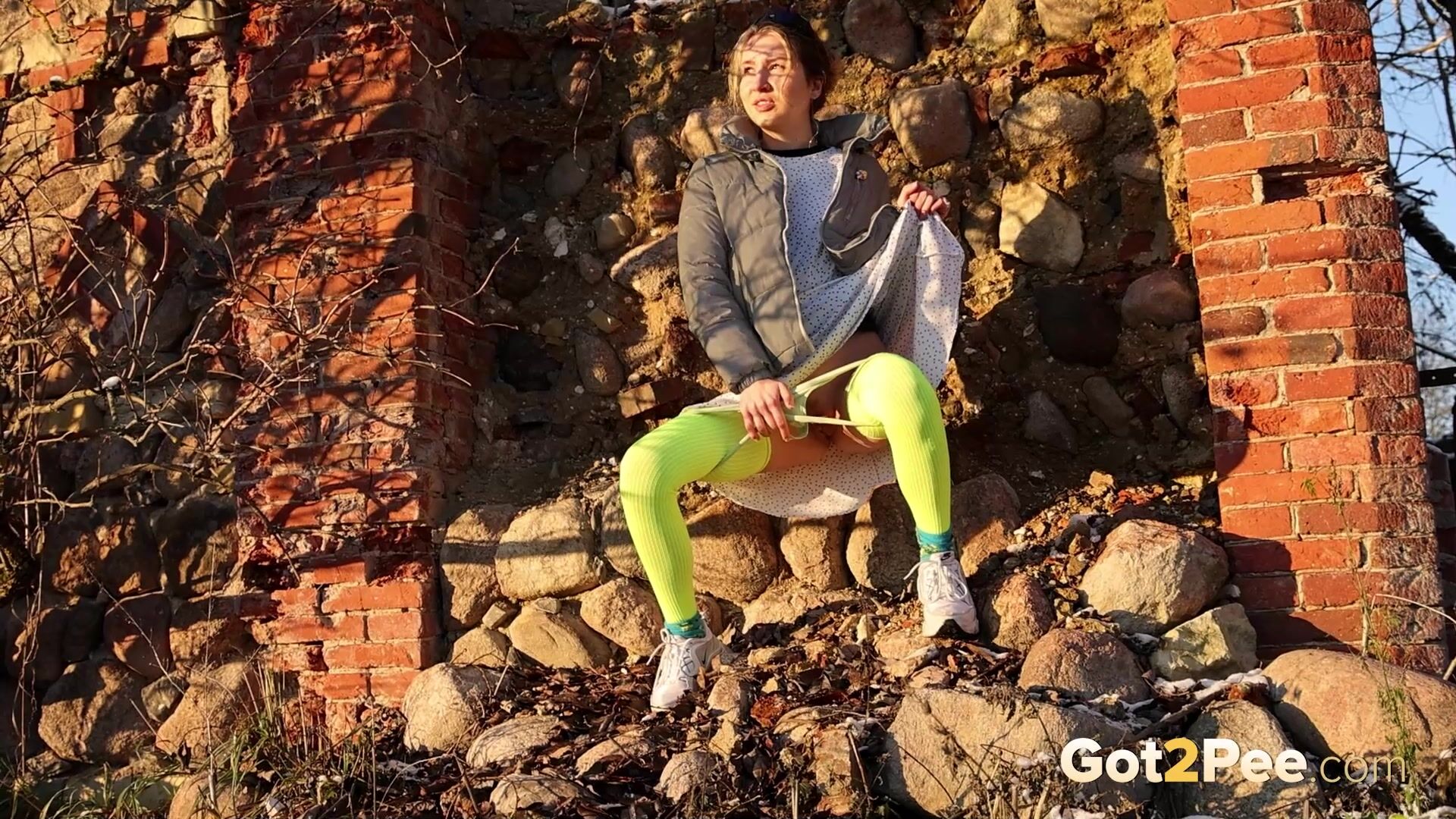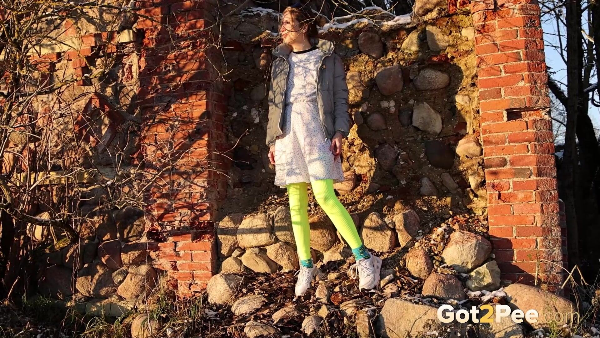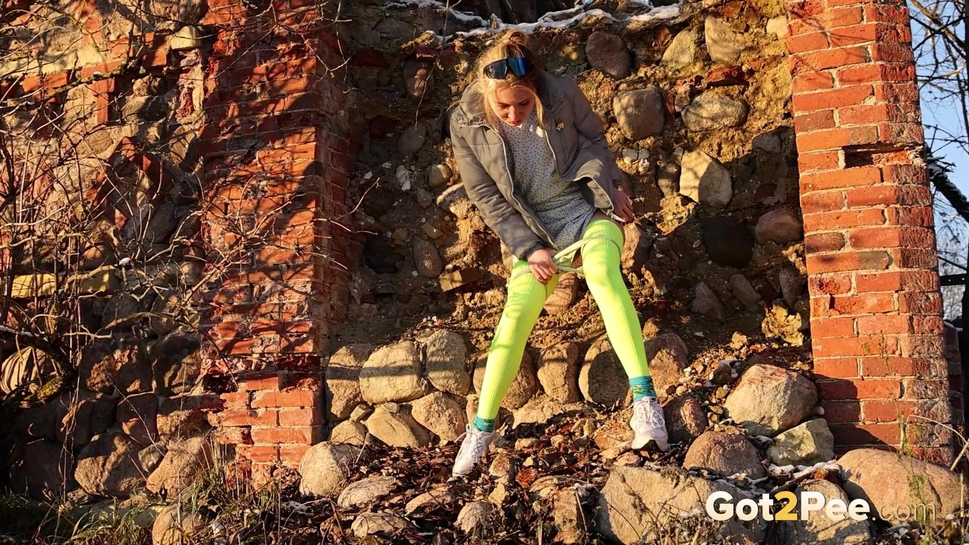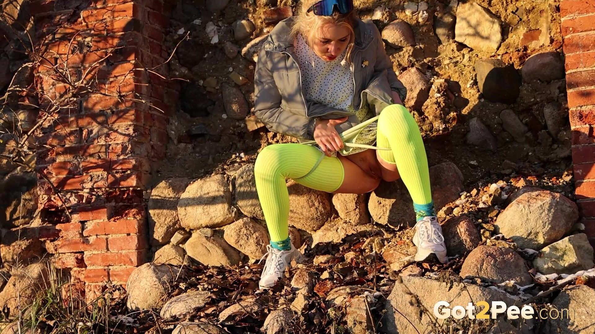 On a cold icy day a cute European walks along a road until she finds some ruins. She stops and looks around before she decides to relieve her piss desperation right there and then. After some slight hesitation, this babe pulls down her panties and is filmed squatting to pee in her neon stockings! Watch this blonde pissing all over the rubble below.