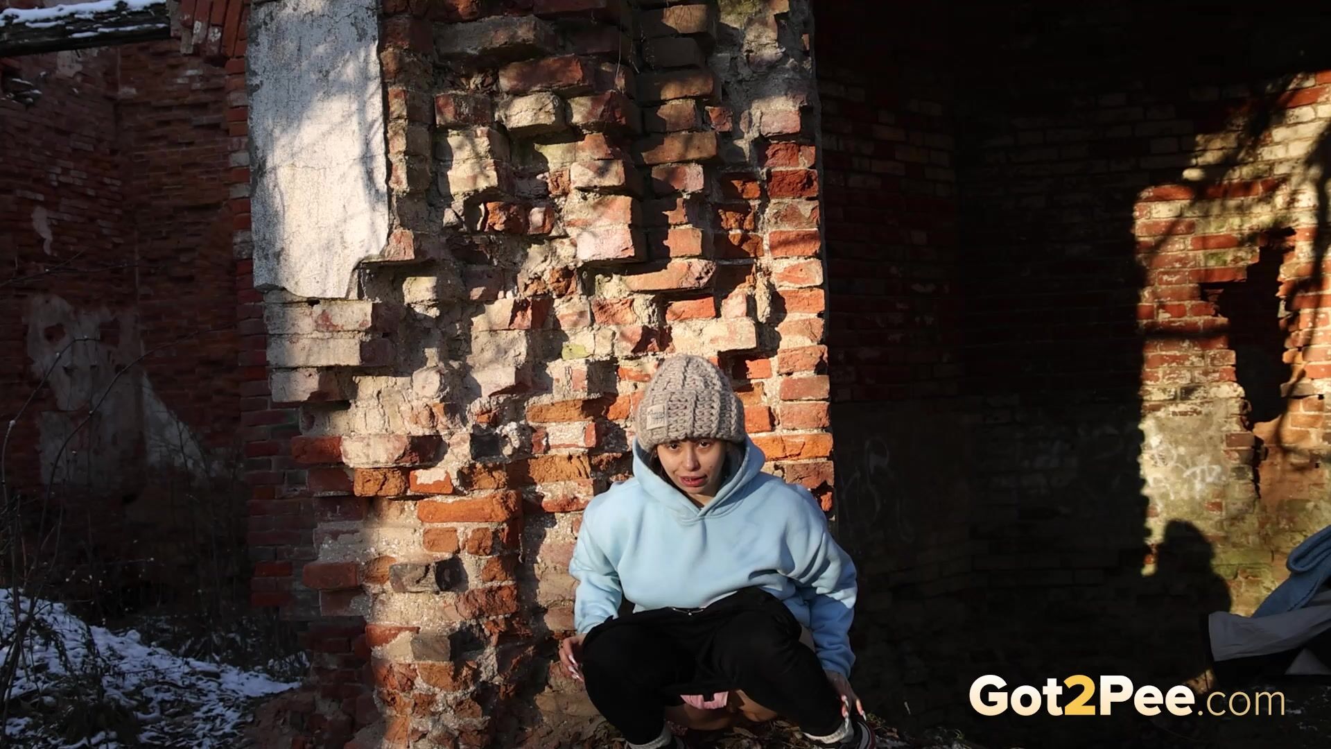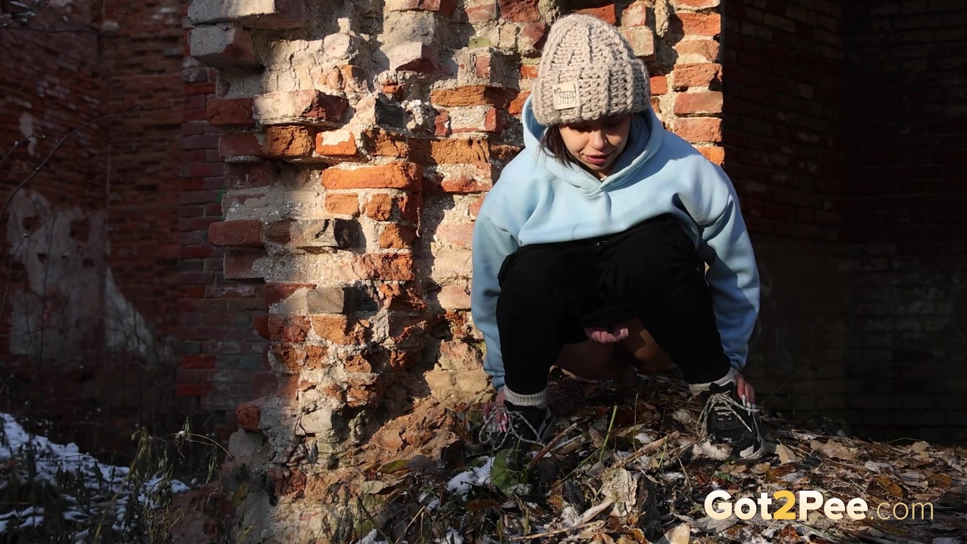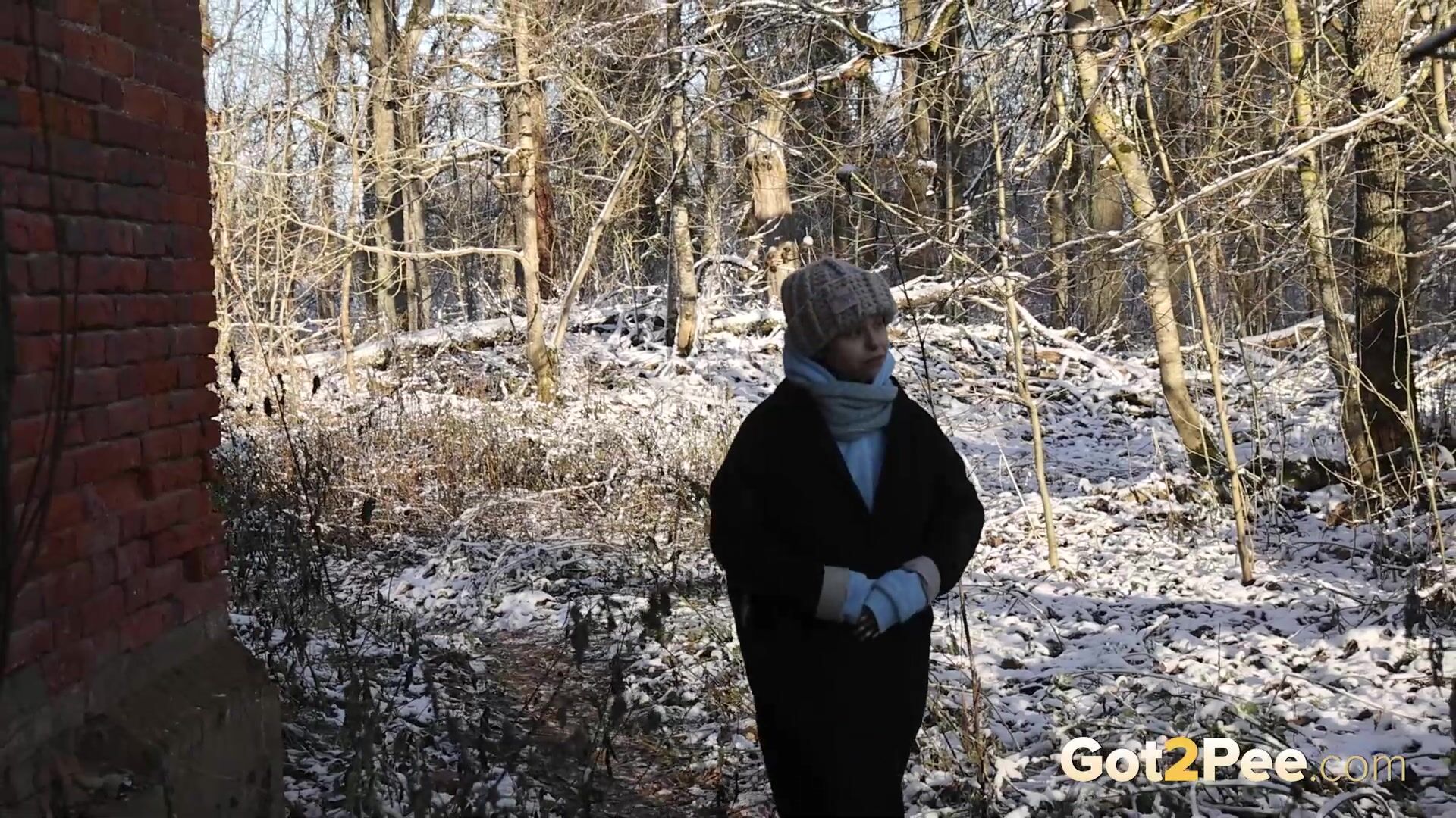 A petite European is all wrapped up in winter clothes when she looks for the perfect place to relieve her piss desperation. She takes off her jacket and scarf before squatting to pee next to some ruins. We zoom in on this girl as she relieves herself in our latest Got2Pee scene!