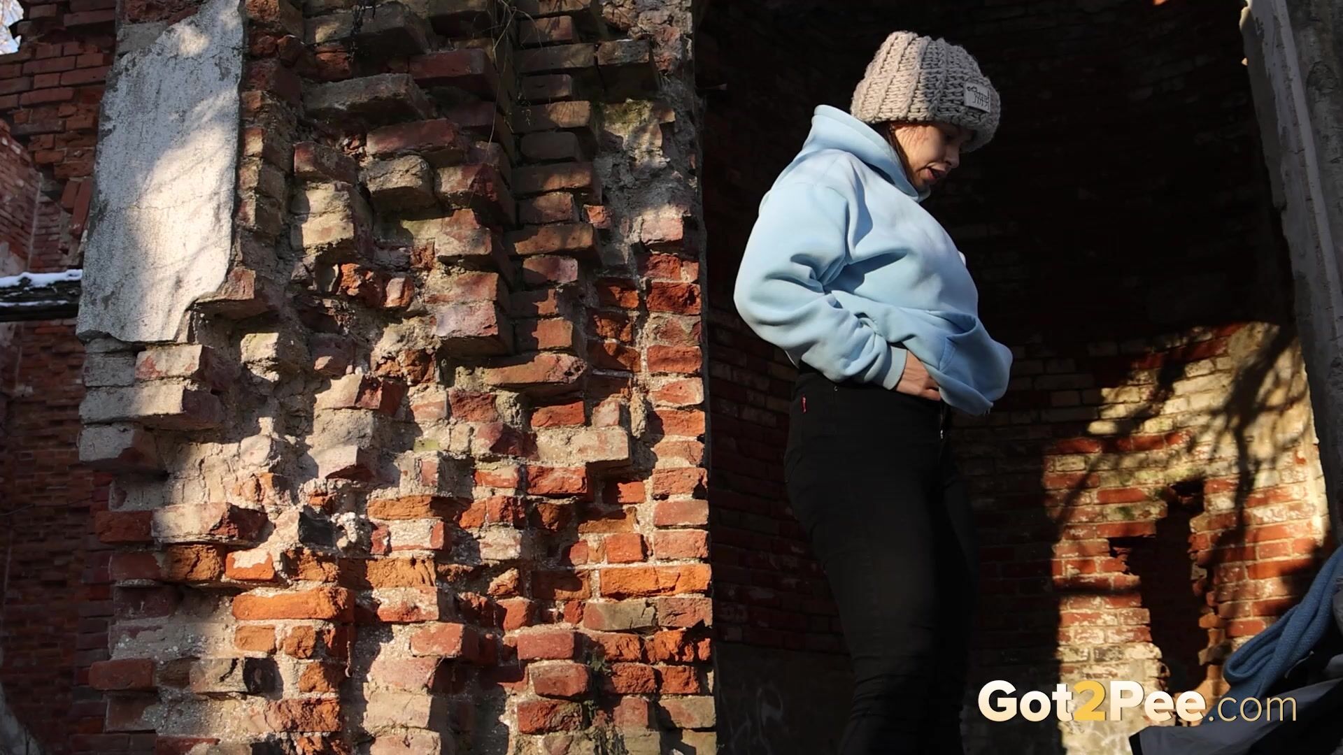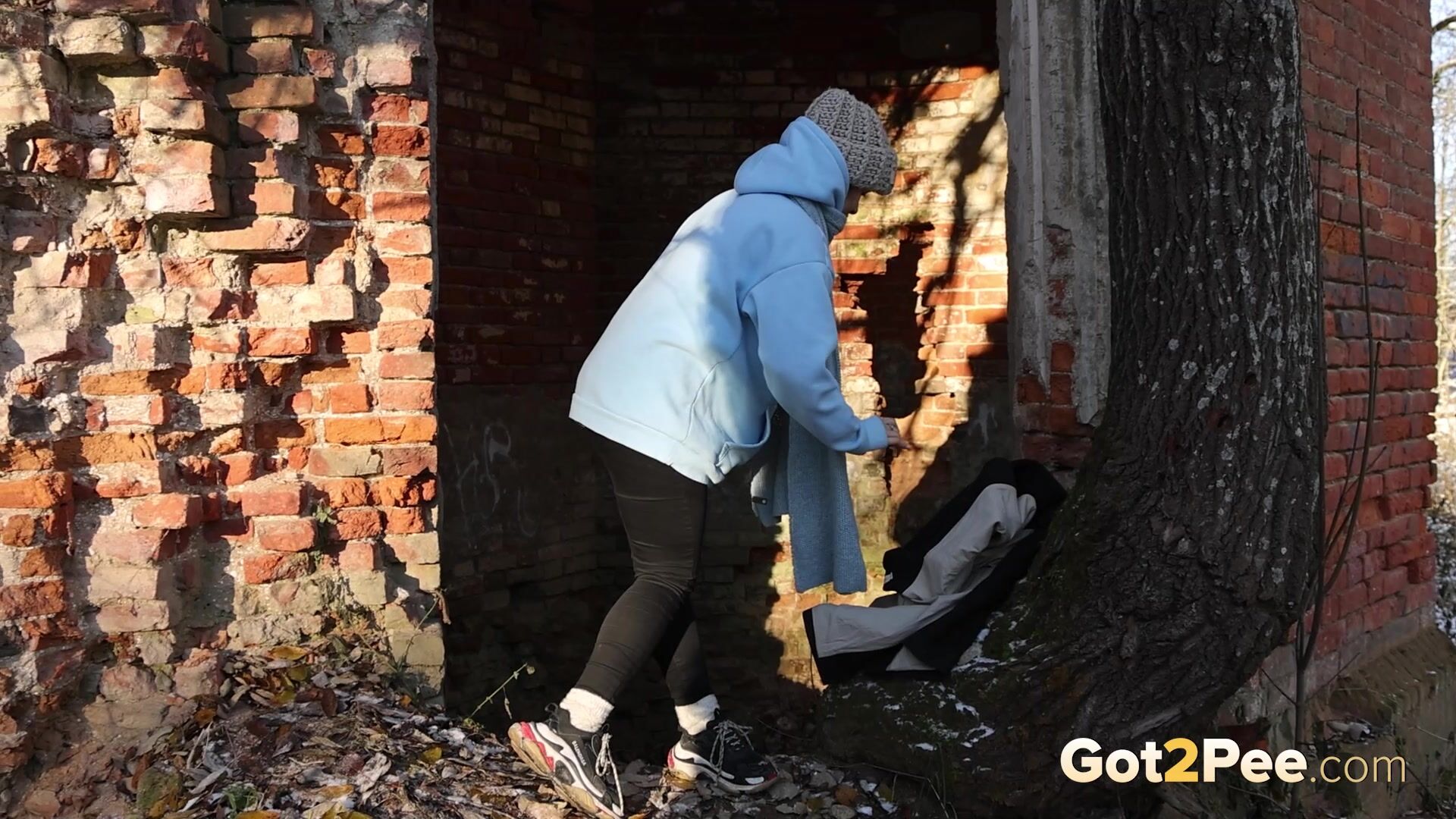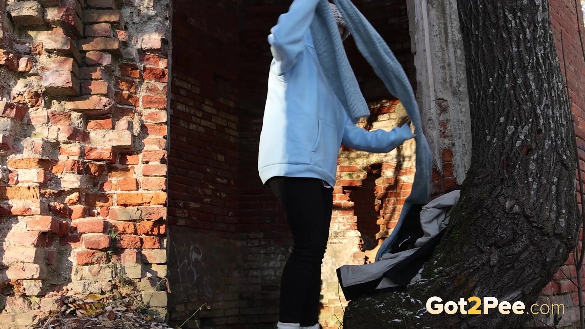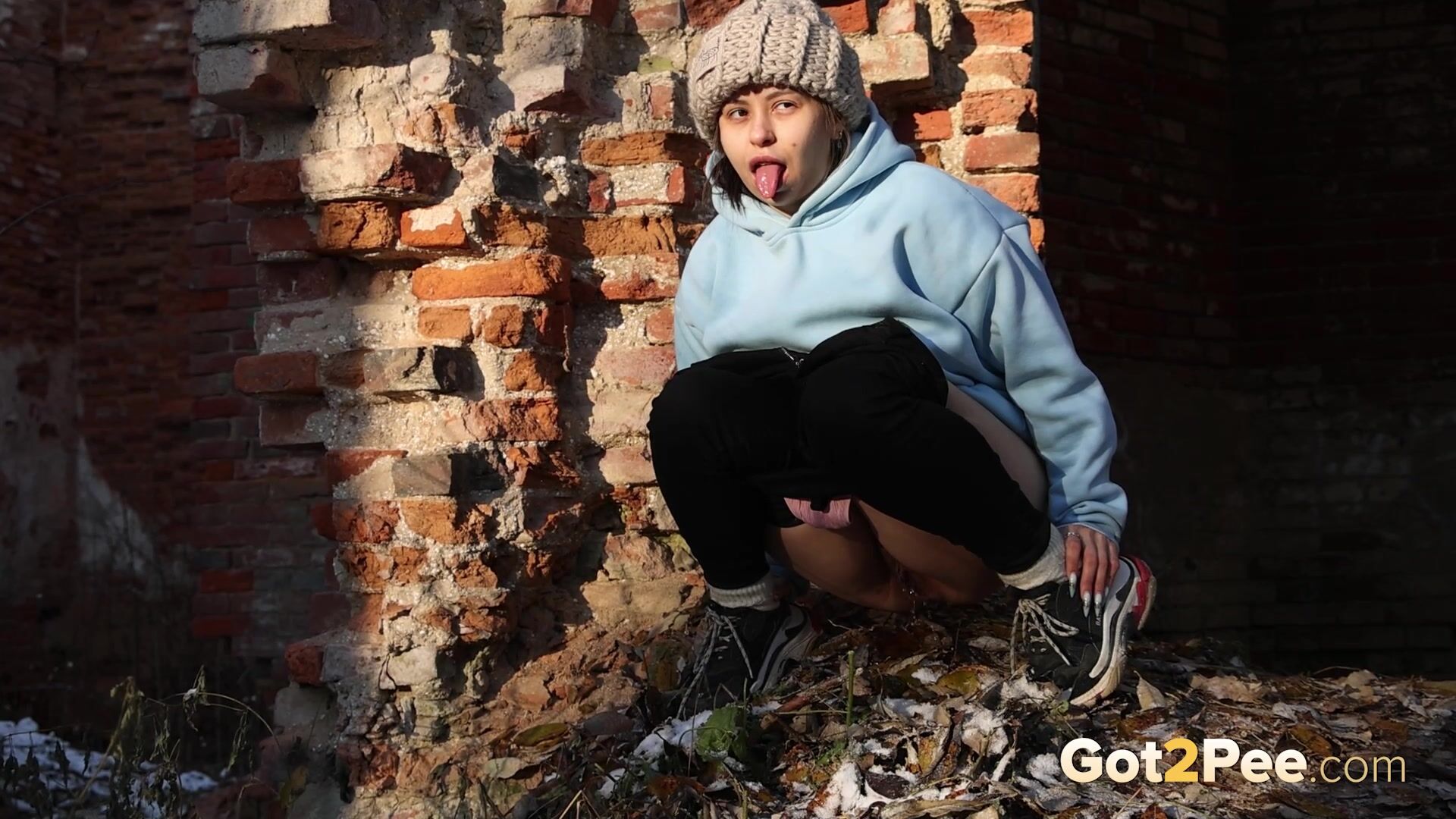 A petite European is all wrapped up in winter clothes when she looks for the perfect place to relieve her piss desperation. She takes off her jacket and scarf before squatting to pee next to some ruins. We zoom in on this girl as she relieves herself in our latest Got2Pee scene!