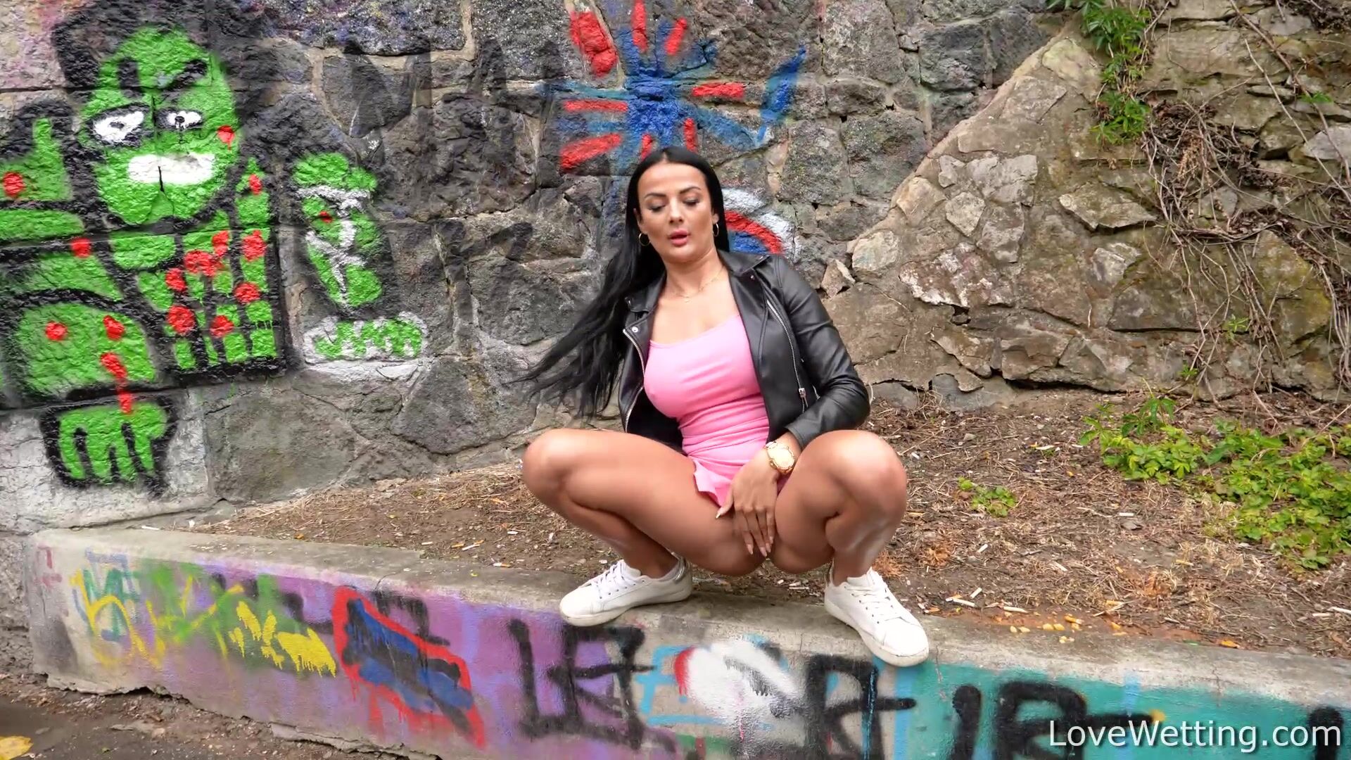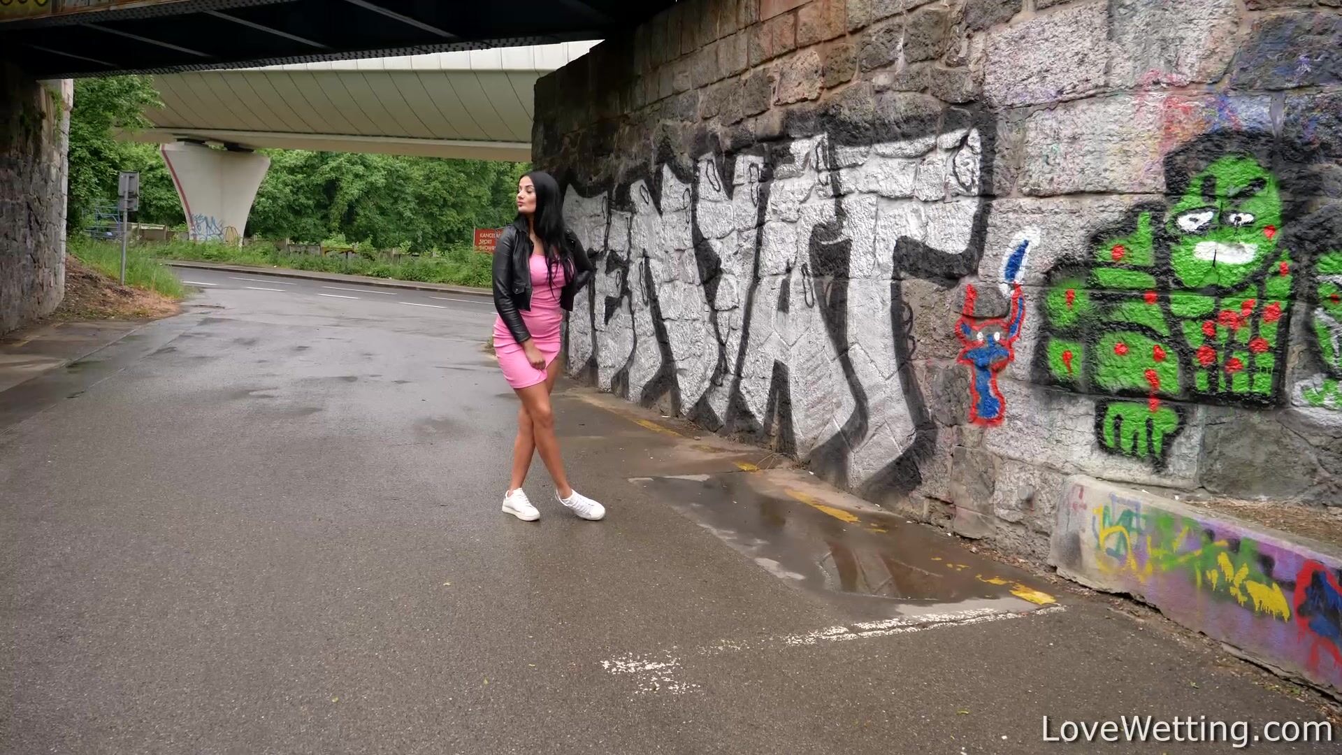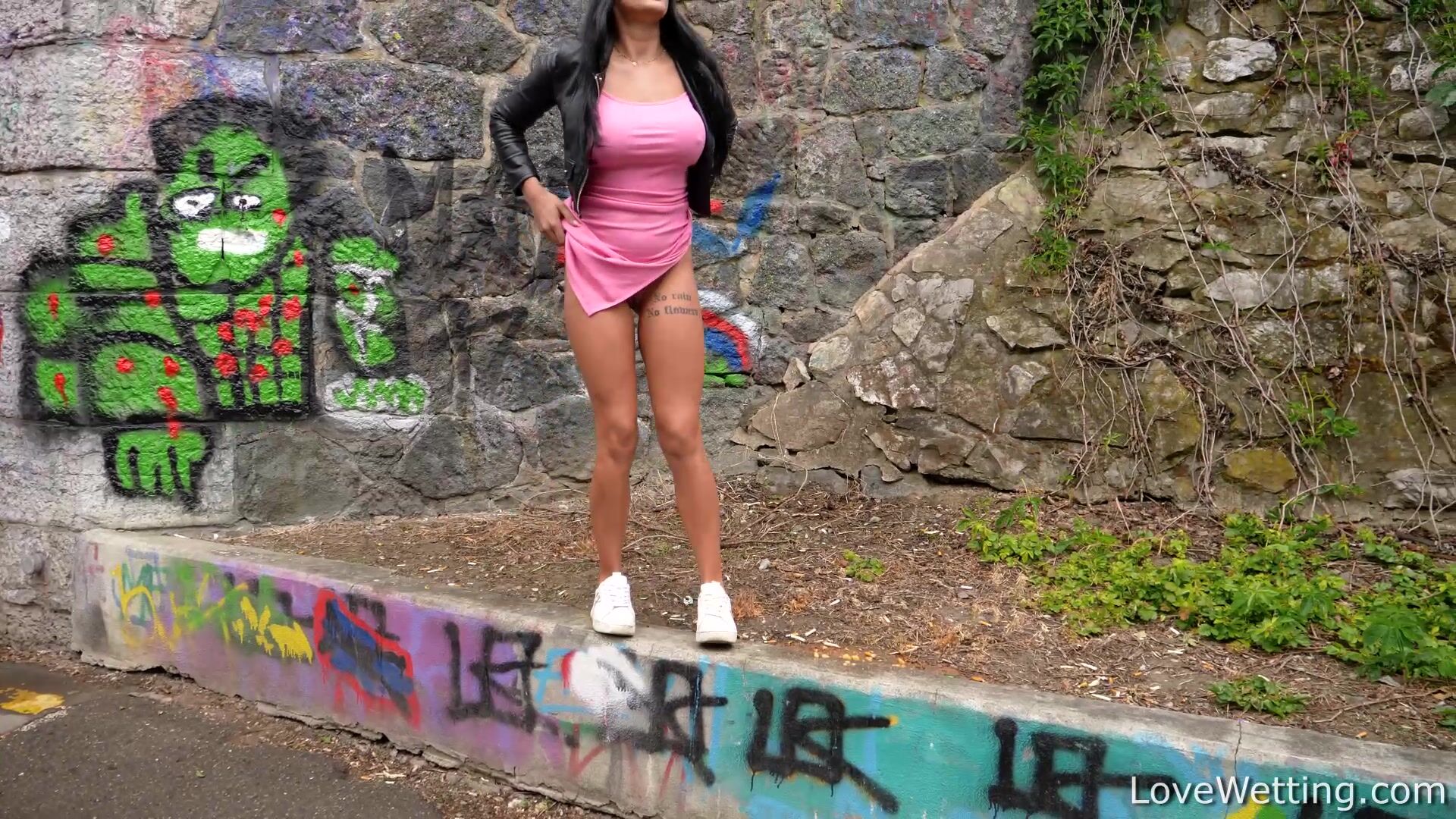Oooooh today we can see Silvia's nipples sticking out as she does a squat peeing after the rain on the wet road near the graffiti (another graffiti wall? how many are there...)