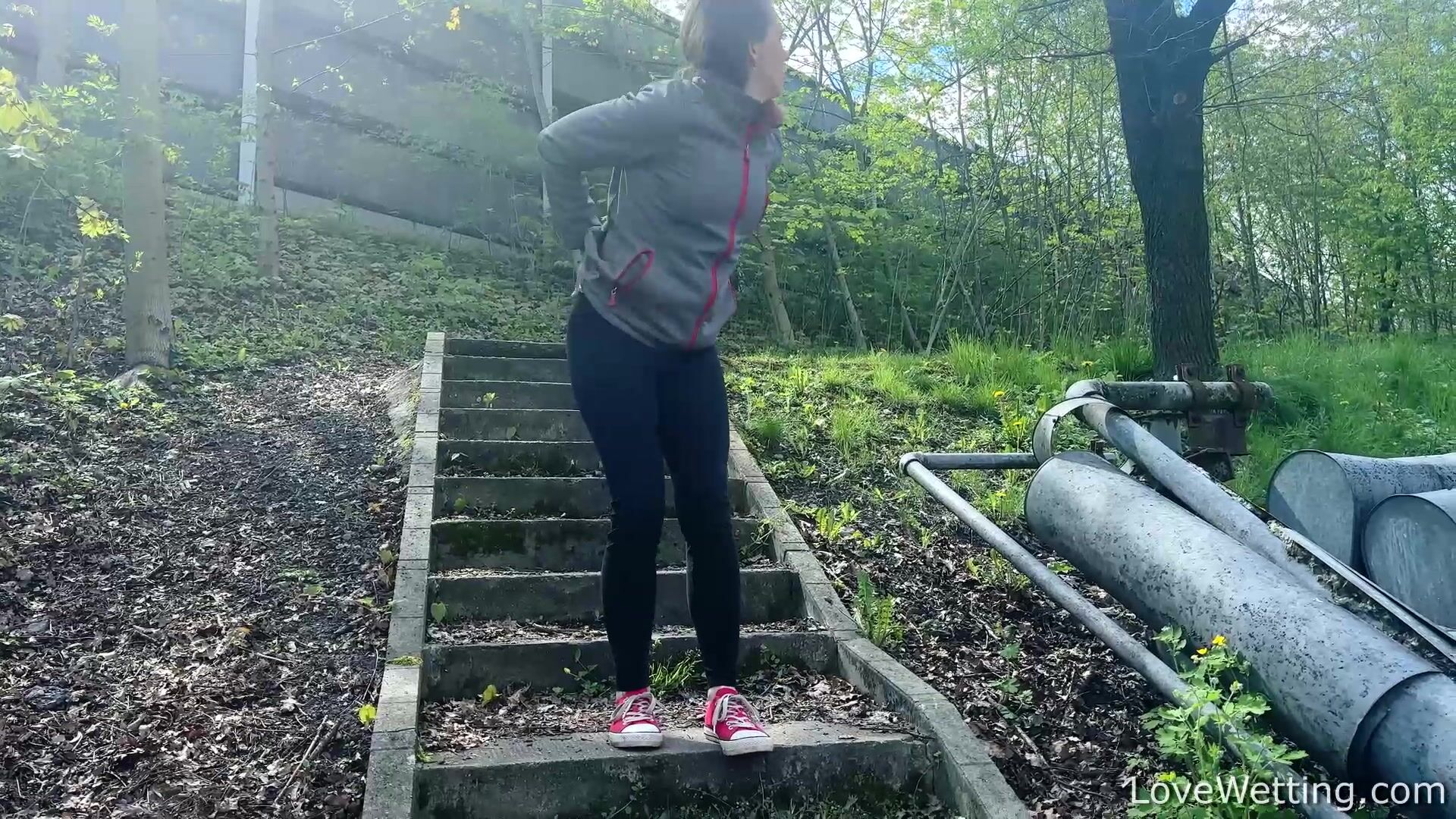 In a secluded spot in the woods, in the sunshine, Veronika decided to have a sweet pee on the stairs.