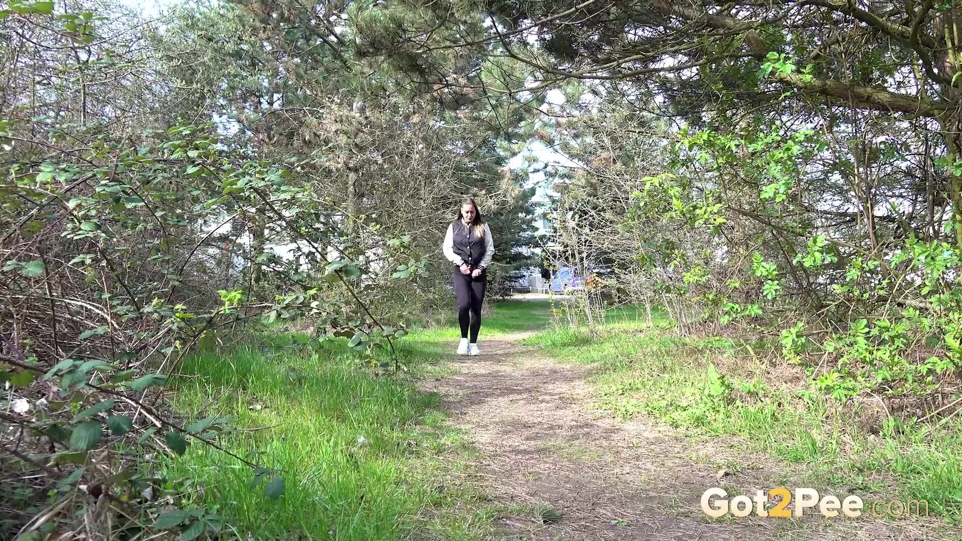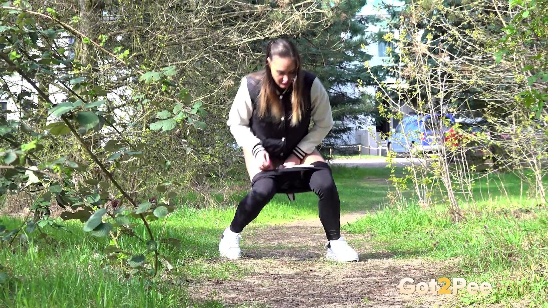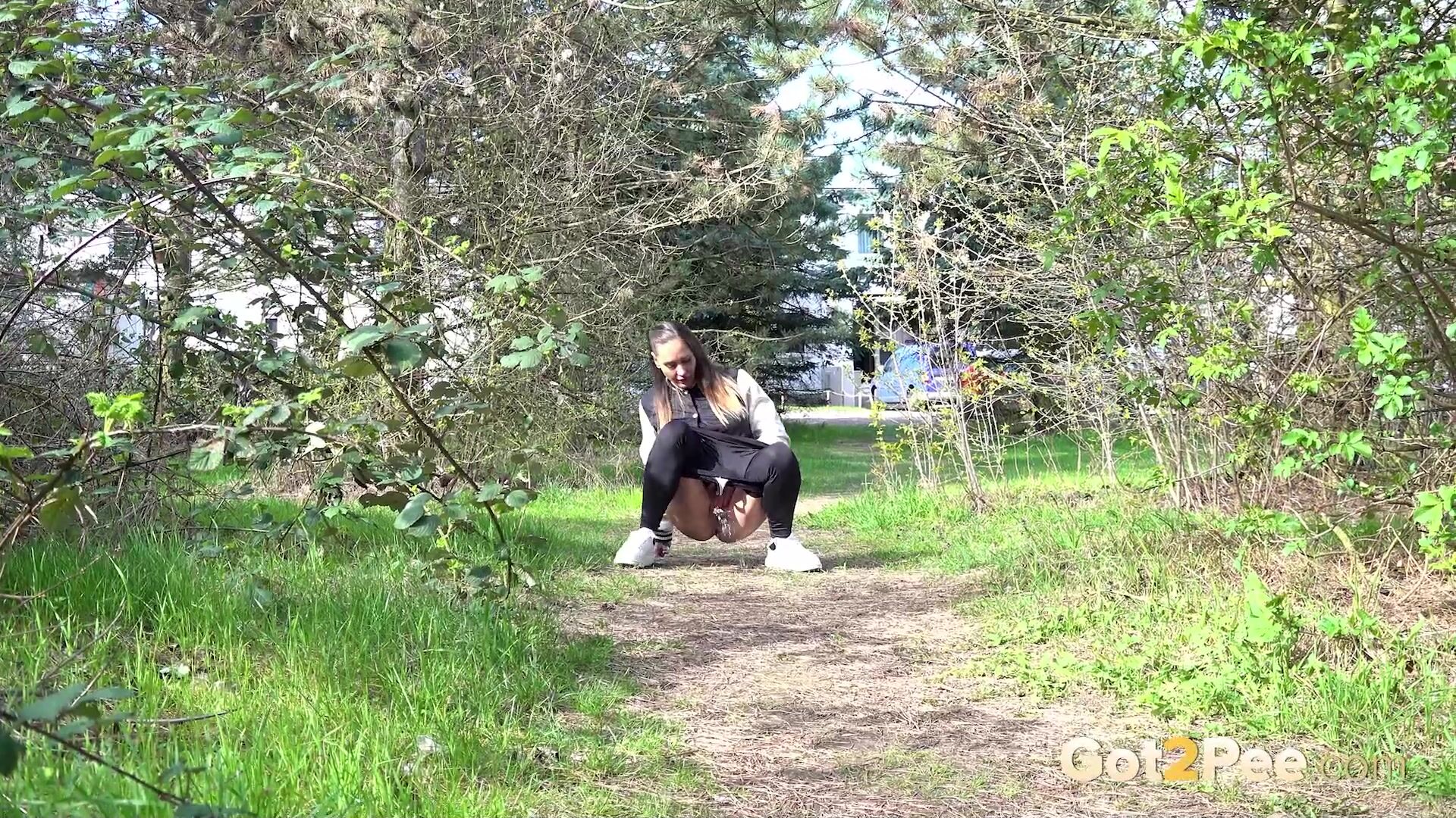Naomi Benet is ready for her newest Got2Pee scene and this brunette babe is out enjoying a walk in the suburbs. She suddenly decides to stop and relieve her piss desperation while we film her squatting to pee. Nearly sitting on the ground, Naomi holds her pussy while peeing outside.