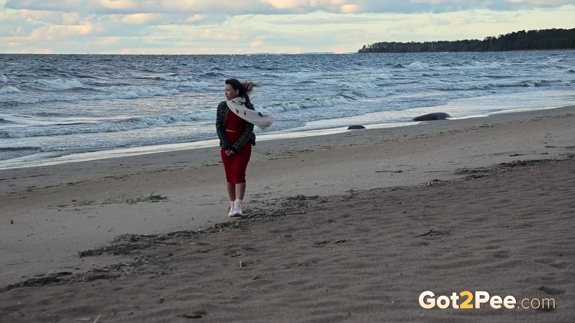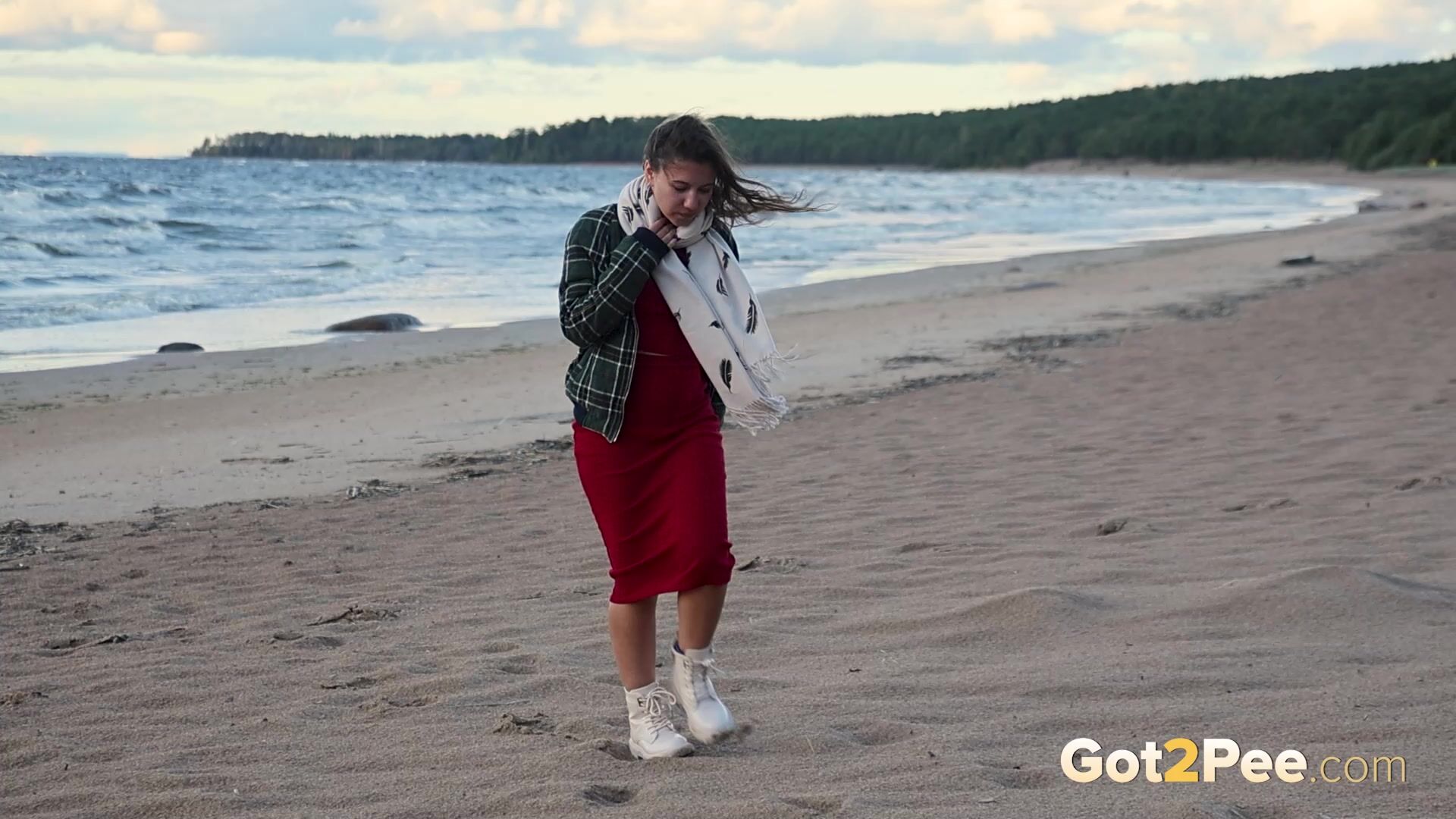 Watch our newest Got2Pee video featuring a gorgeous brunette who walks around the beach on a windy say. She looks around for somewhere secluded to relieve her piss desperation and stops near some driftwood before lifting up her red midi skirt. This babe takes another look around, then pulls off her panties before she gets filmed pissing with her legs held wide apart! The wind catches her pee stream, blowing it back towards her face in this hot pissing porno!