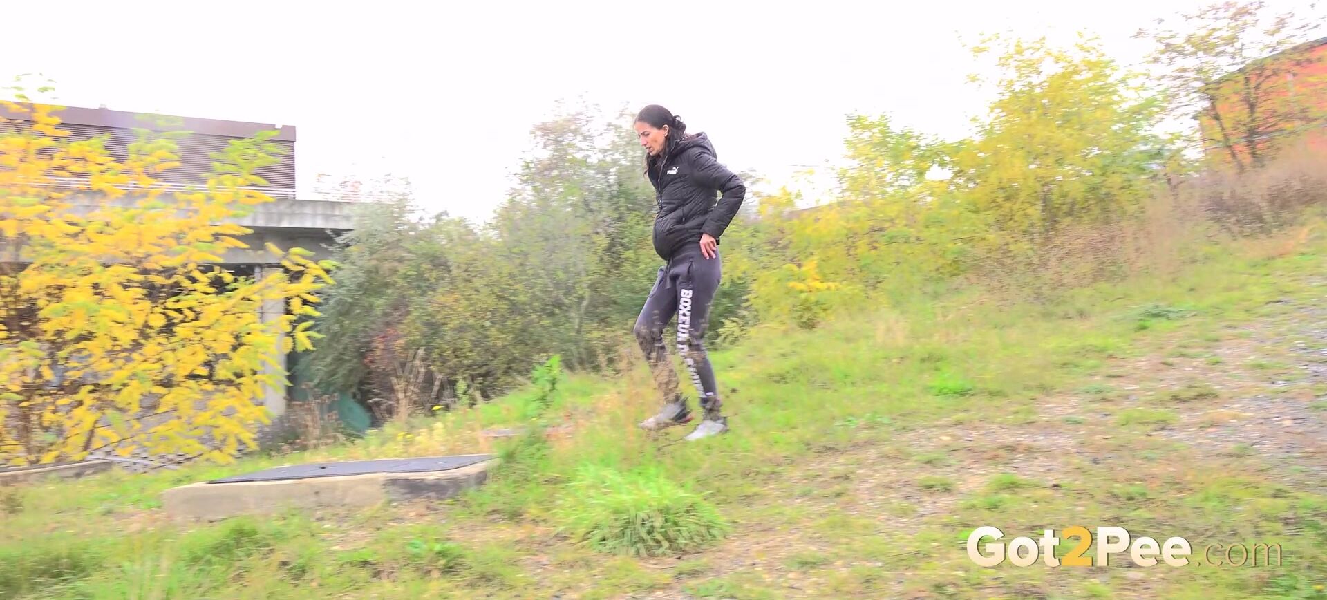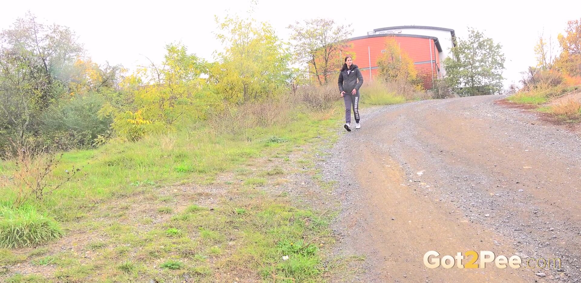 Brunette hottie Ali B walks down a path in the suburbs by some buildings. She stops on top of a drain and pulls down her joggers. Squatting to pee, Ali relieves her pee desperation and we zoom in close on her stream for our latest Got2Pee scene. Ali takes her time to make sure she has emptied her bladder properly!