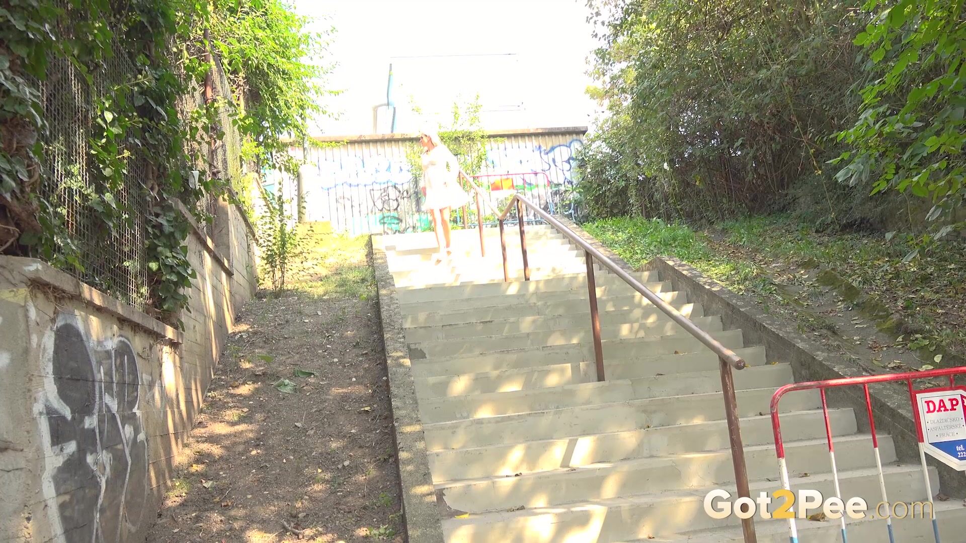 A hot blonde walks down some steps in the suburbs when she decides to relieve her piss desperation. She pulls up her floaty dress and squatting to pee, lets her juices flow down the steps beneath her! We zoom in close on her public pissing display for our newest Got2Pee scene.
