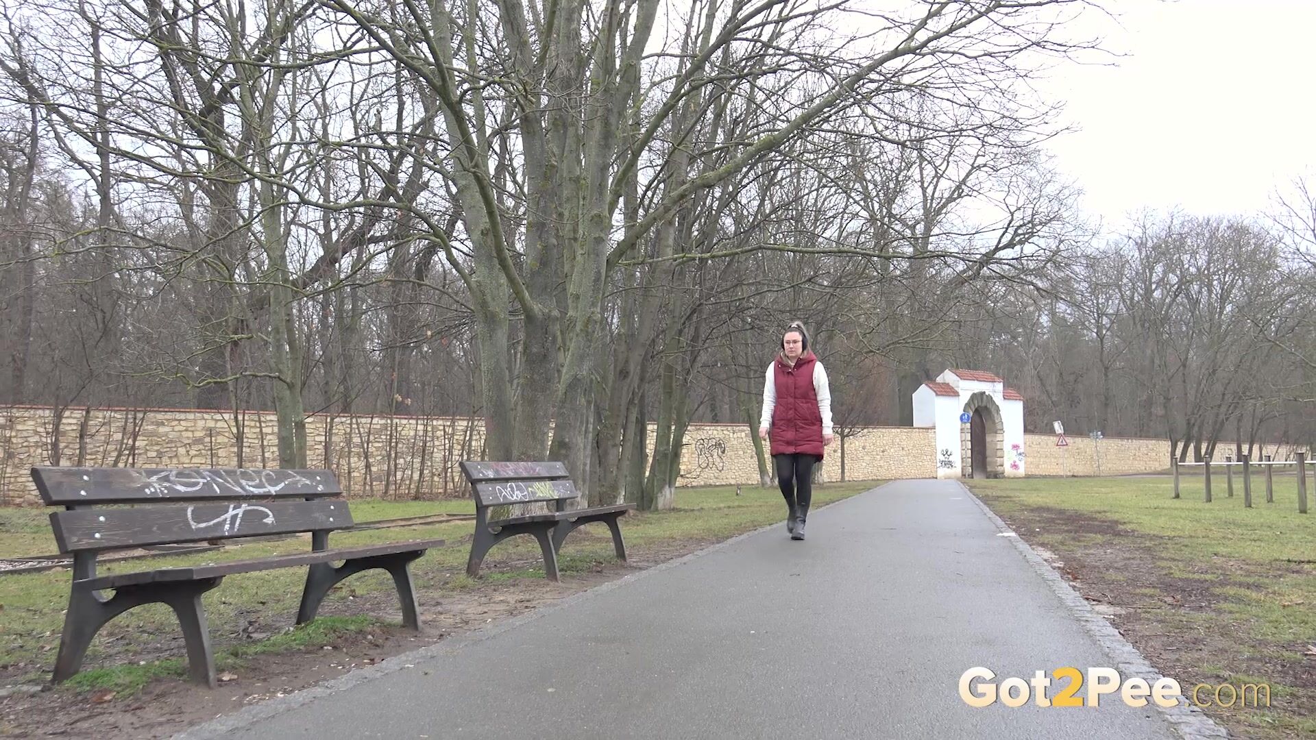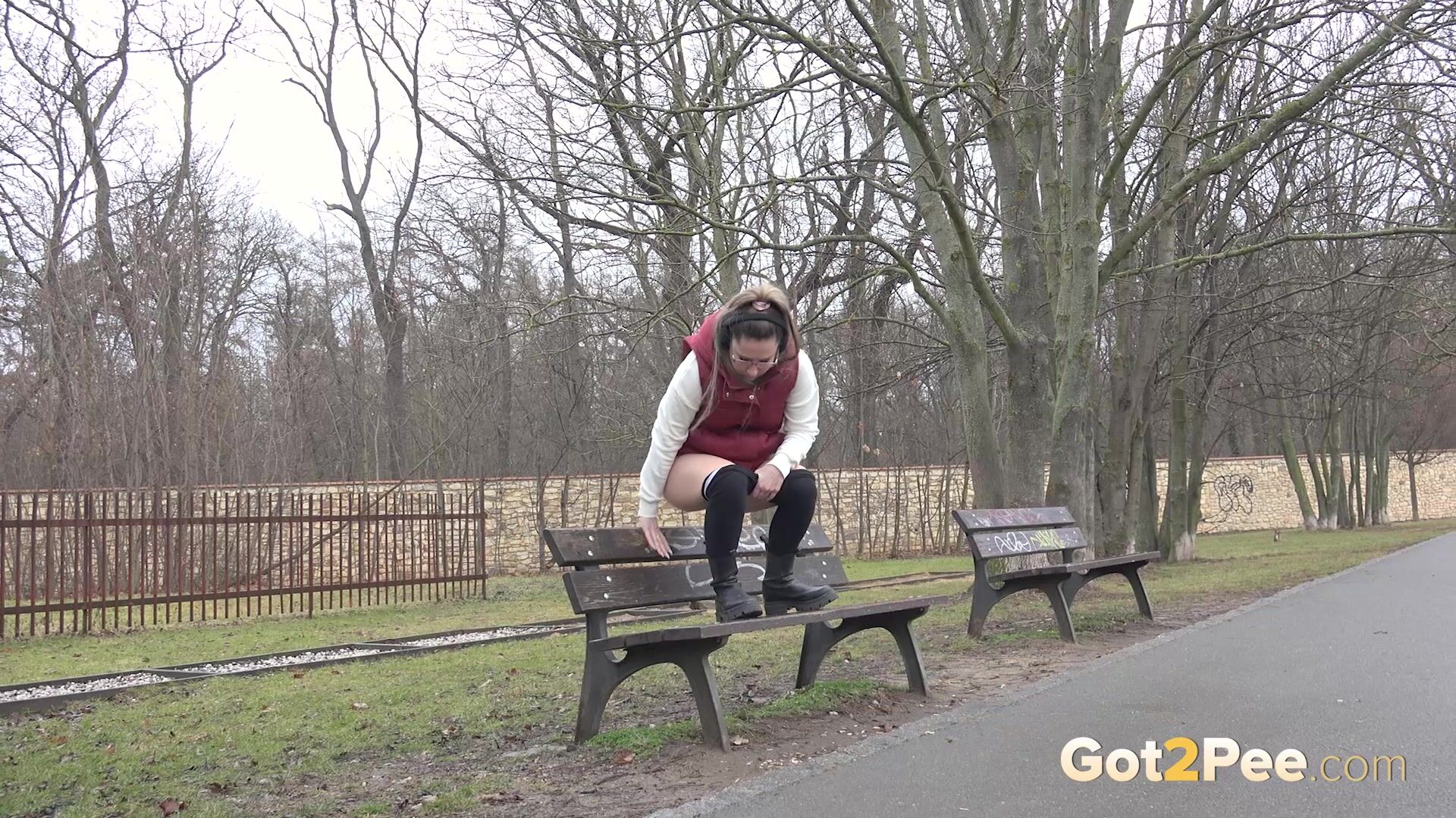 Lovely Lara Fox returns to Got2Pee as she walks down a path in the suburbs listening to music on her headphones. She needs to relieve her pee desperation with no toilets in sight, so she climbs up onto a wooden bench. Squatting to pee, Lara holds onto her pussy as her golden stream flows over the edge and onto the ground.