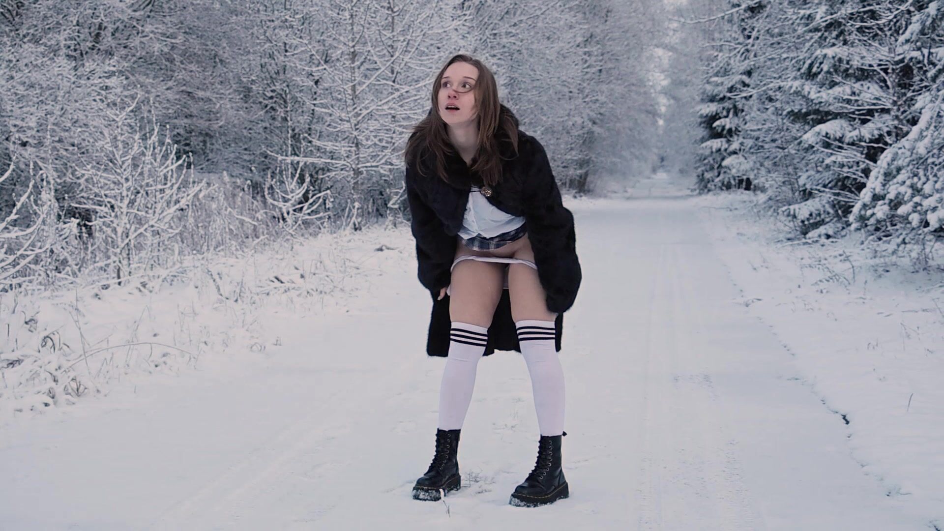 Wrap up warm for our latest pissing porno as Alice Klay takes a stroll in the snow in a faux fur coat. She stops in the middle of the road and pulls off her panties before turning around to spread her legs wide apart. This naughty babe enjoys a pee standing and melts a pee puddle into the snow. Wiping her pussy clean with her panties, this is one Got2Pee update you won't want to miss!