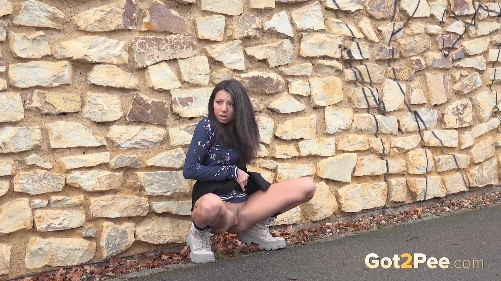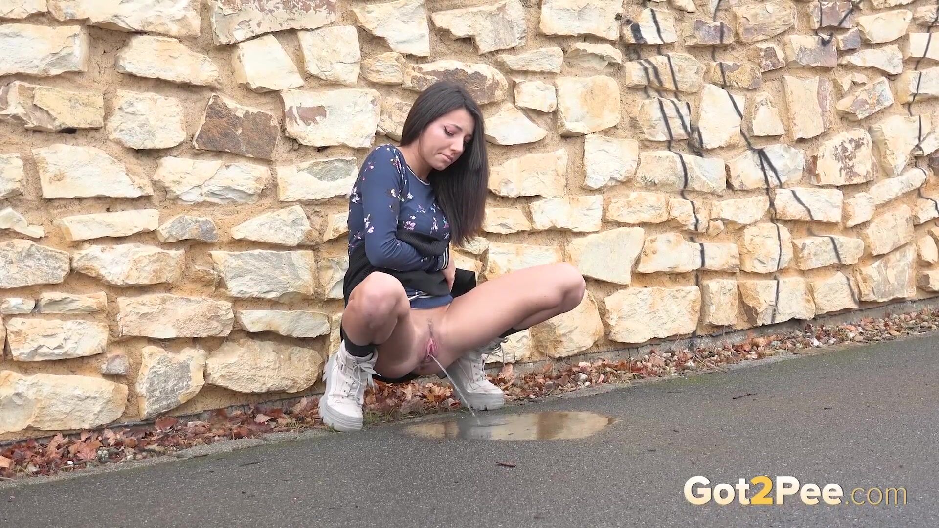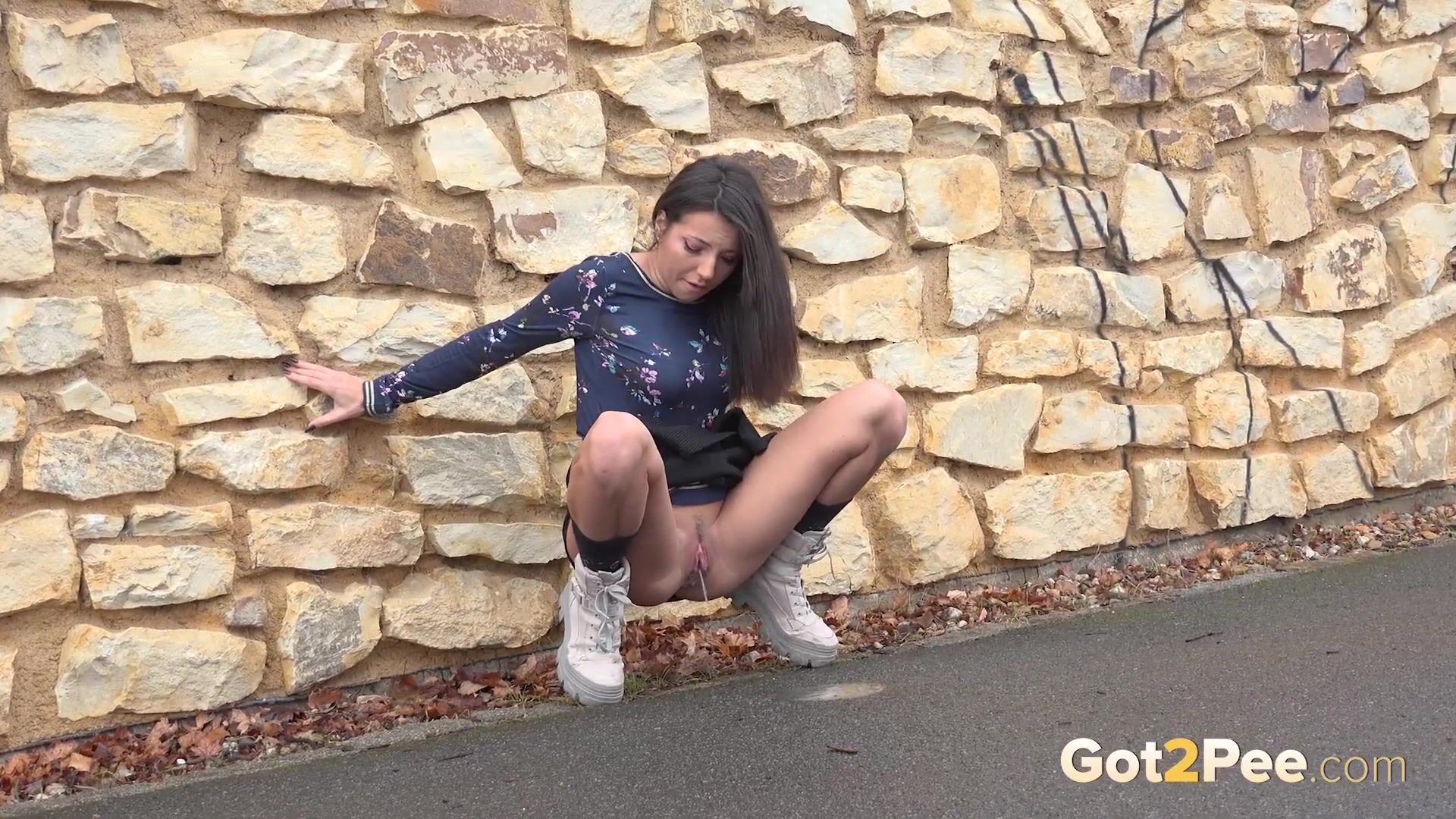 Mini Mitzi features in our latest Got2Pee pissing porno as she walks alongside a stone wall in the suburbs. She stops suddenly and holds onto her crotch as she lifts up her miniskirt. Mini Mitzi is filmed squatting to pee as she holds onto the wall for balance. We zoom in close as she sprays a neat stream of piss onto the ground and makes a juicy pee puddle!