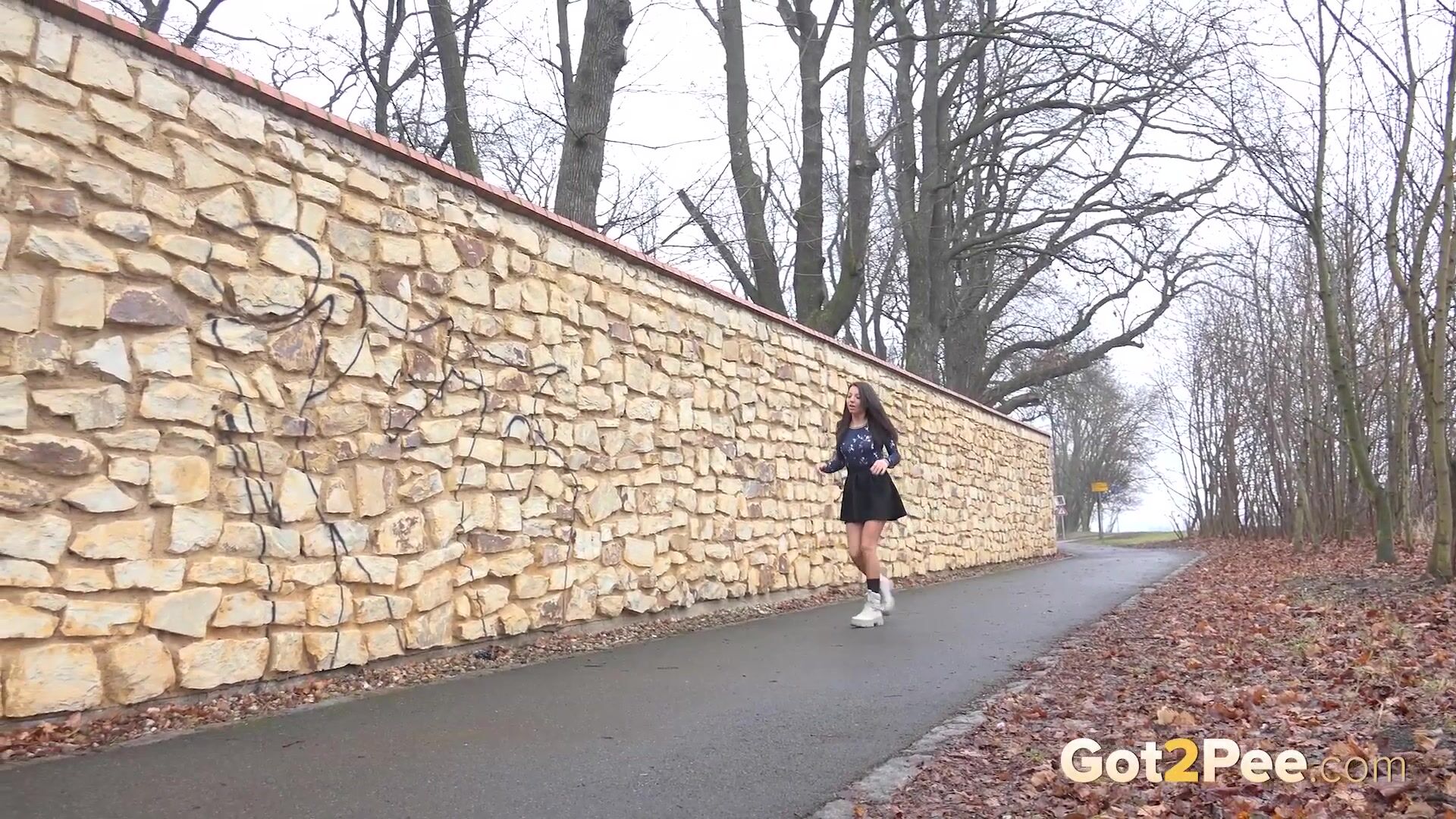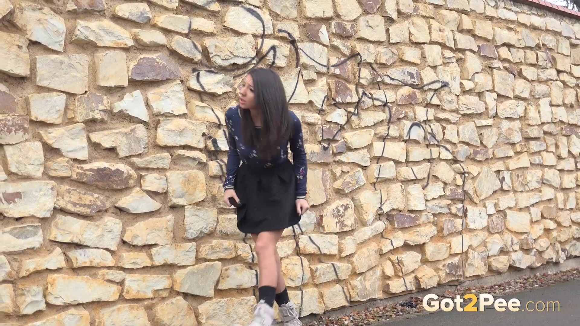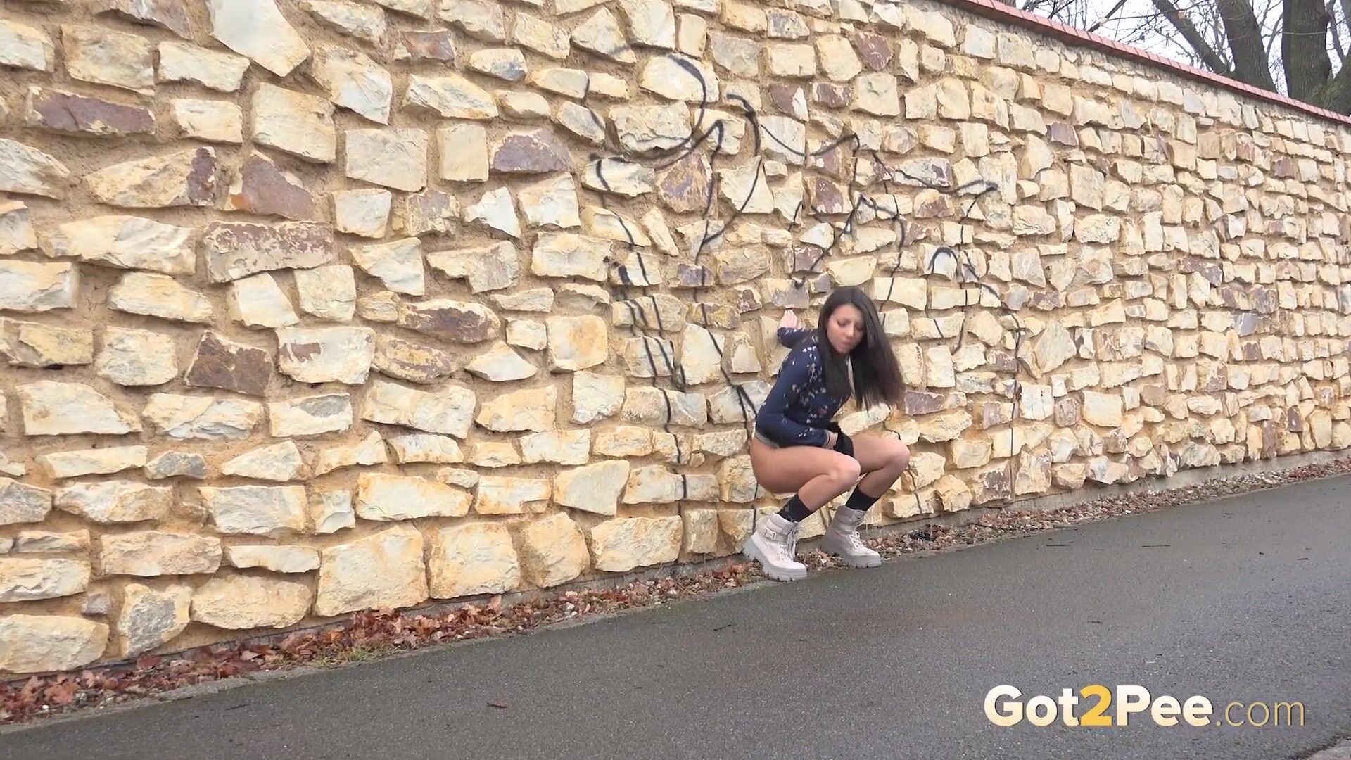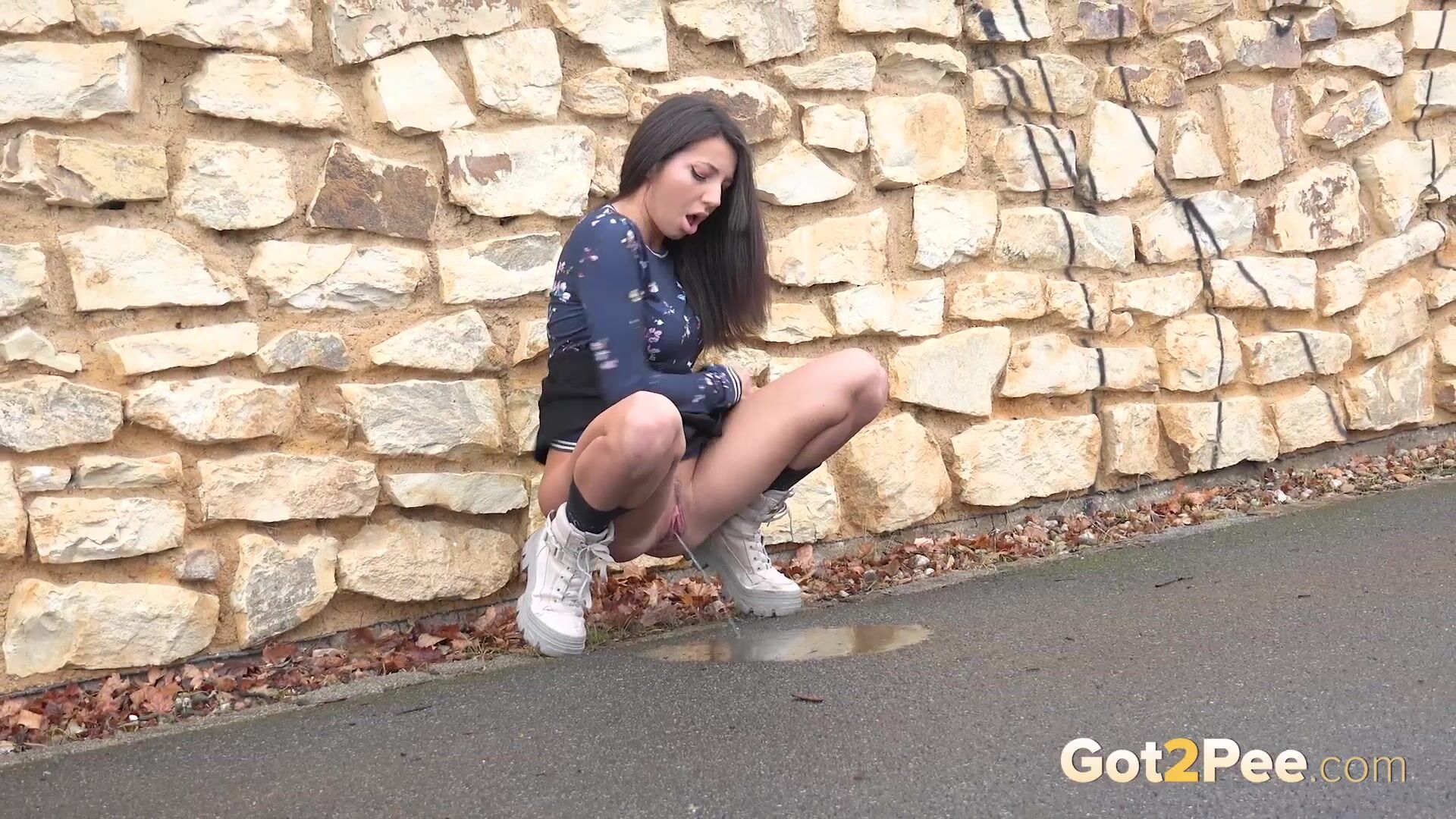Mini Mitzi features in our latest Got2Pee pissing porno as she walks alongside a stone wall in the suburbs. She stops suddenly and holds onto her crotch as she lifts up her miniskirt. Mini Mitzi is filmed squatting to pee as she holds onto the wall for balance. We zoom in close as she sprays a neat stream of piss onto the ground and makes a juicy pee puddle!