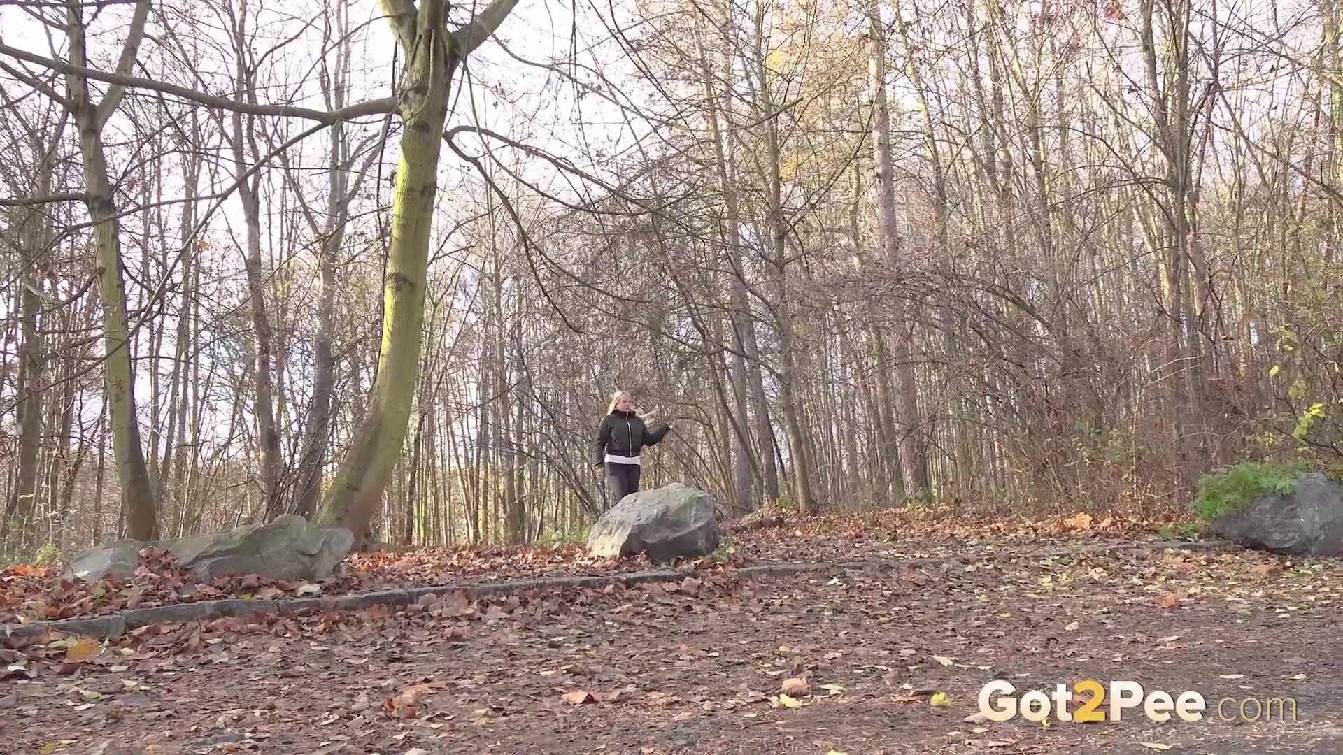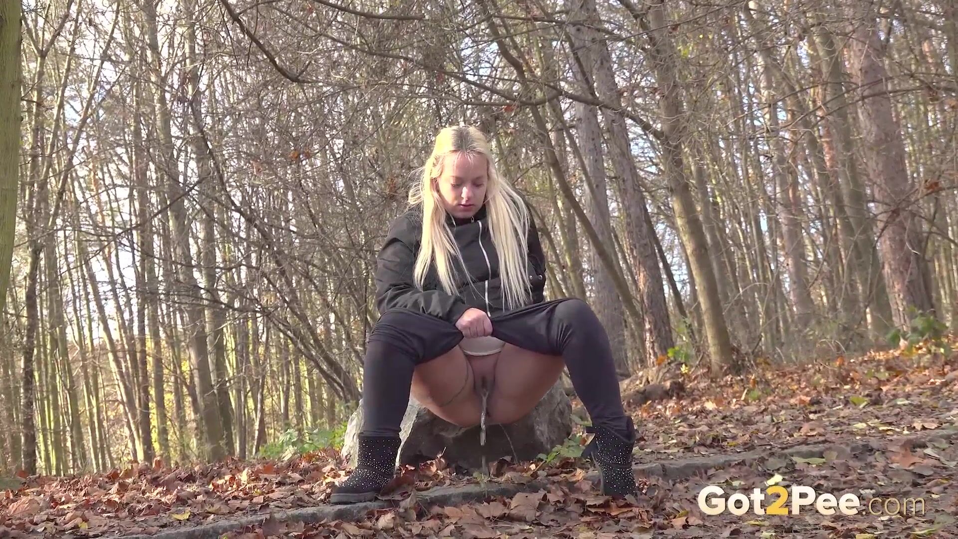A long haired European blonde walks into a clearing at the edge of the woodland and decides to relieve her piss desperation. While squatting to pee, we film her as she sprays a steamy piss down onto the fallen leaves for our newest Got2Pee pissing porno