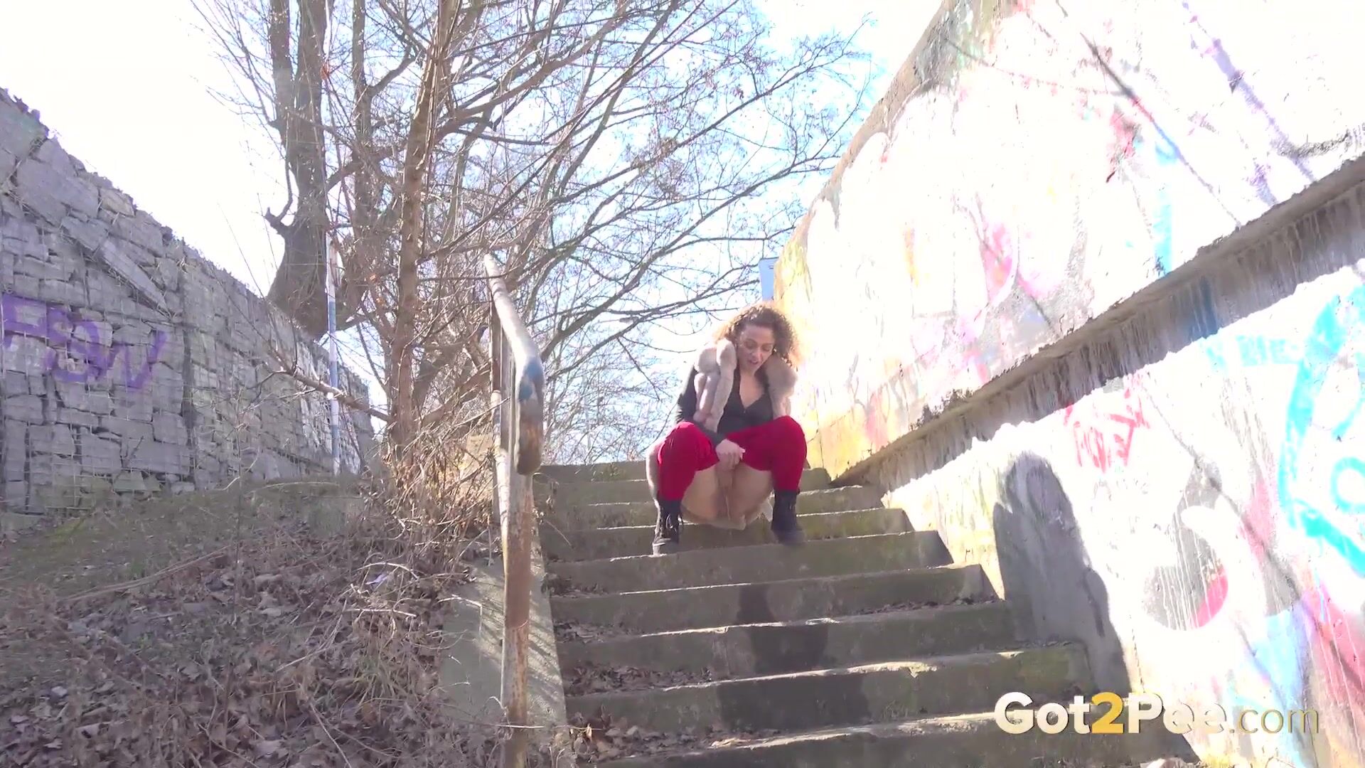 Today on Got2Pee our newest pissing porn scene features a curly haired European who can't wait to get her red leggings down while on some steps in the suburbs! Squatting to pee, this babe sprays a neat stream of golden piss down over the steps while keeping a lookout at the same time!