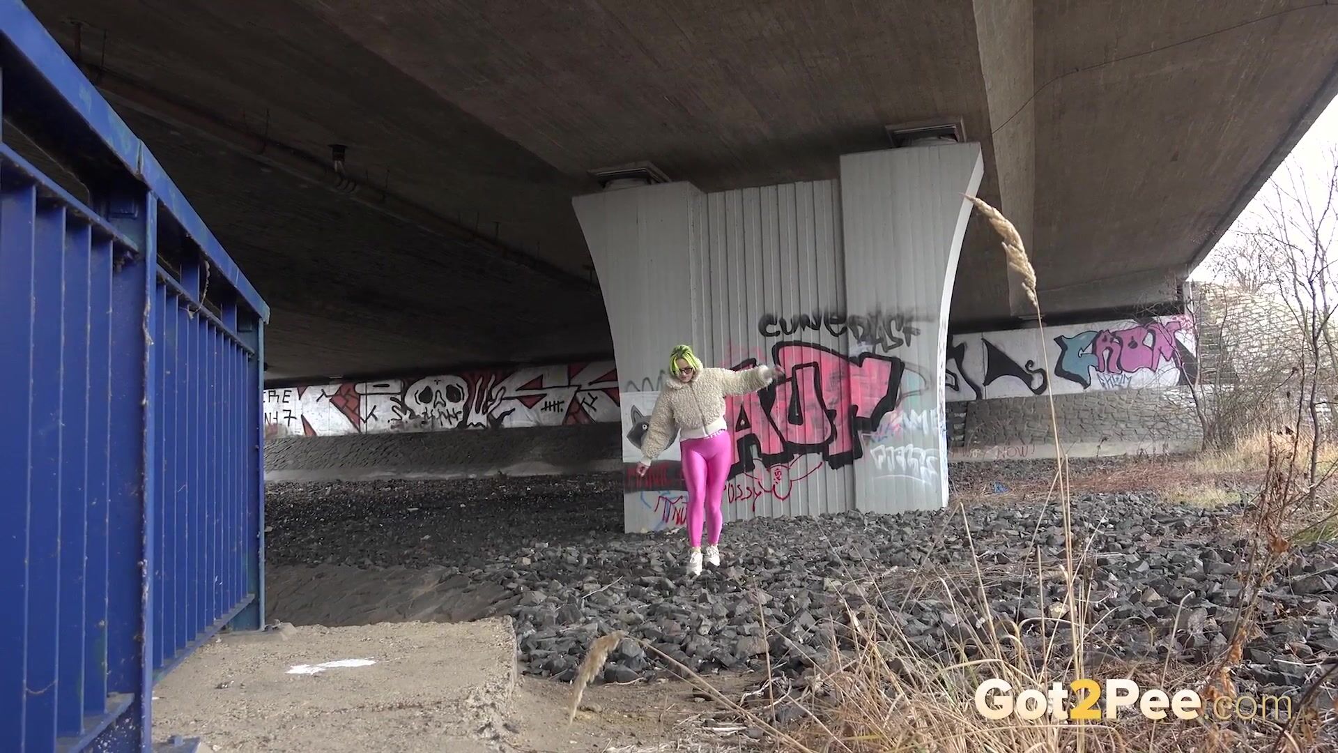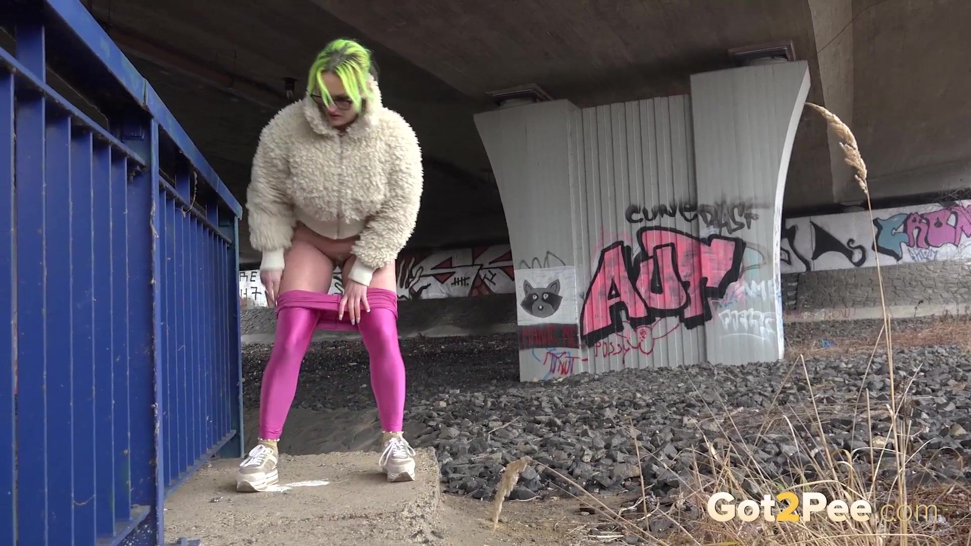 Our latest pissing porn scene features punk babe Barbara Bieber who carefully walks over some rocky ground under a bridge. She stops next to some blue railings and pulls down her pink spandex leggings before she enjoys a pee standing while we film her for Got2Pee. She ends up soaking her leggings with her golden streams and then pulls them up to walk away.