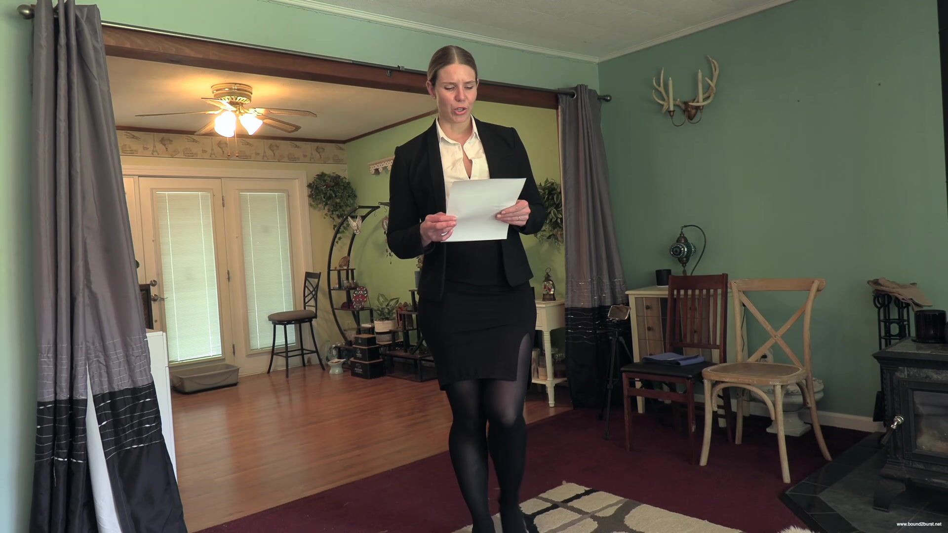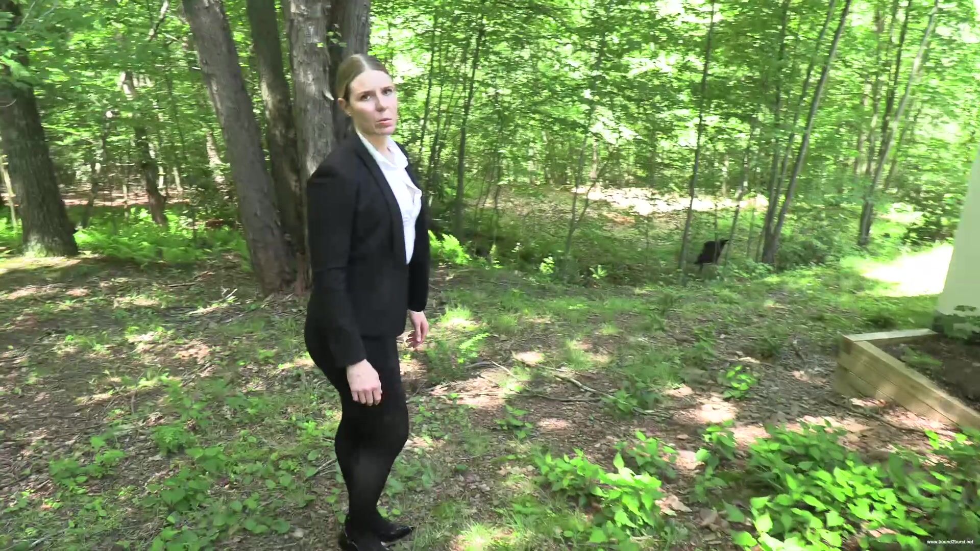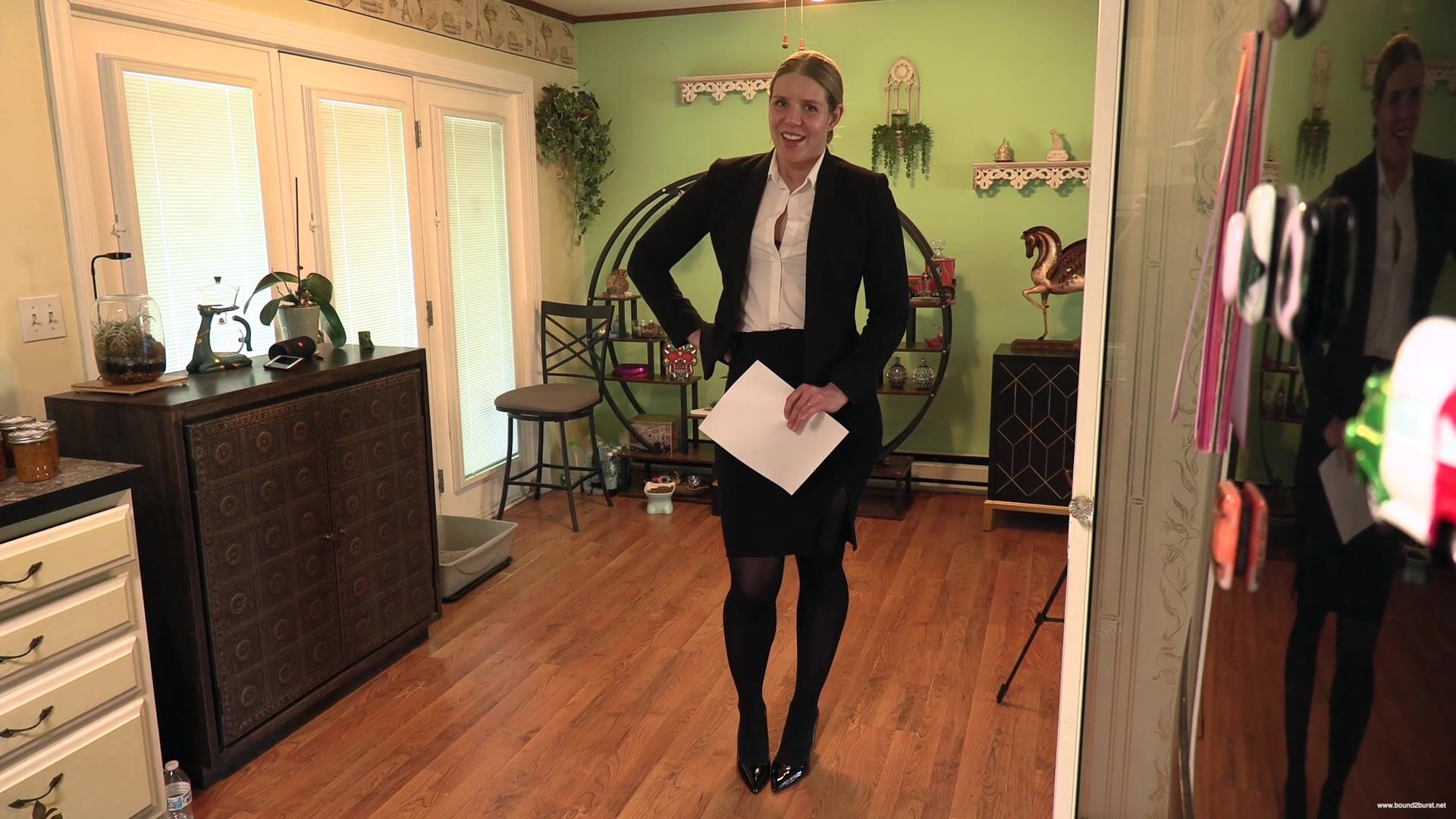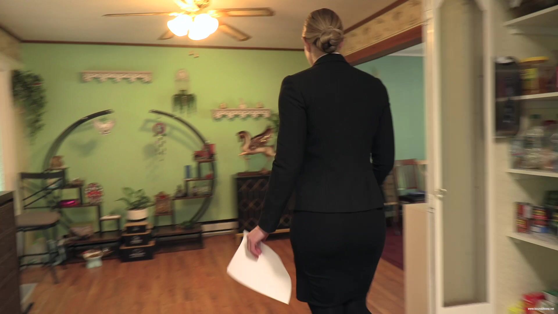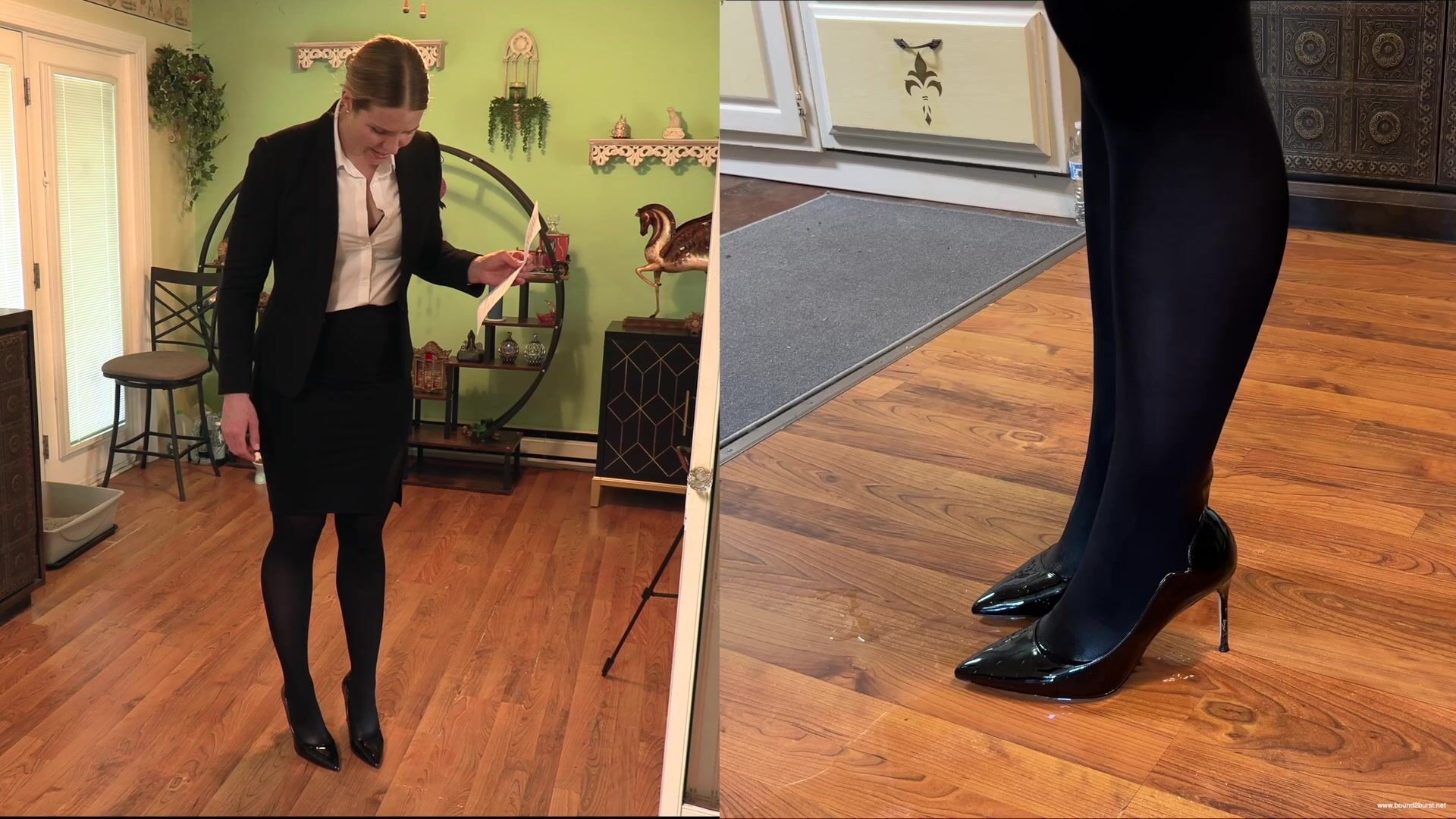 Nina arrives late for a house showing and finds the client waiting for her. She has a problem insofar as she badly needs to pee and hasn't had a chance to do so all morning. After greeting the client and apologizing for her tardiness, she asks him if he would mind waiting just a few more minutes while she goes into the house and tidies a few things away, seemingly at the owner's request. In reality, she makes straight for the bathroom, only to find a sign on the toilet stating Out Of Order. In dismay, she realizes she will have to conduct the tour with a full bladder. At first, she manages to maintain her composure, but soon she is discretely squirming, and then a little less discretely, as the urge to pee grows stronger. She still might have made it to the end of the tour if the client, now concerned about the plumbing, tries both the water taps in the kitchen, bringing Nina to the brink of losing control. She is so distracted now that she can barely finish her sentences, and very soon, she simply can't hold it any longer and wets herself in front of the client. He is not best pleased, but tells her he wants to finish the tour of the house. Walking in pee-filled shoes and squelching with every step, Nina shows him the basement and hopes that he will soon leave so that she can clean herself up.