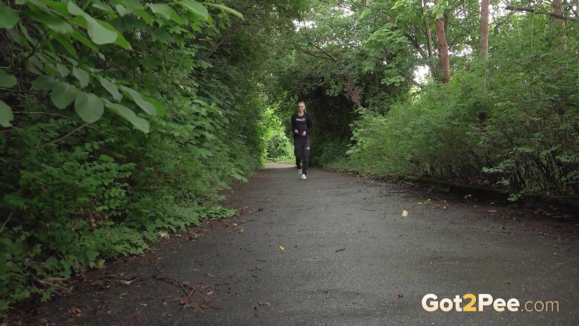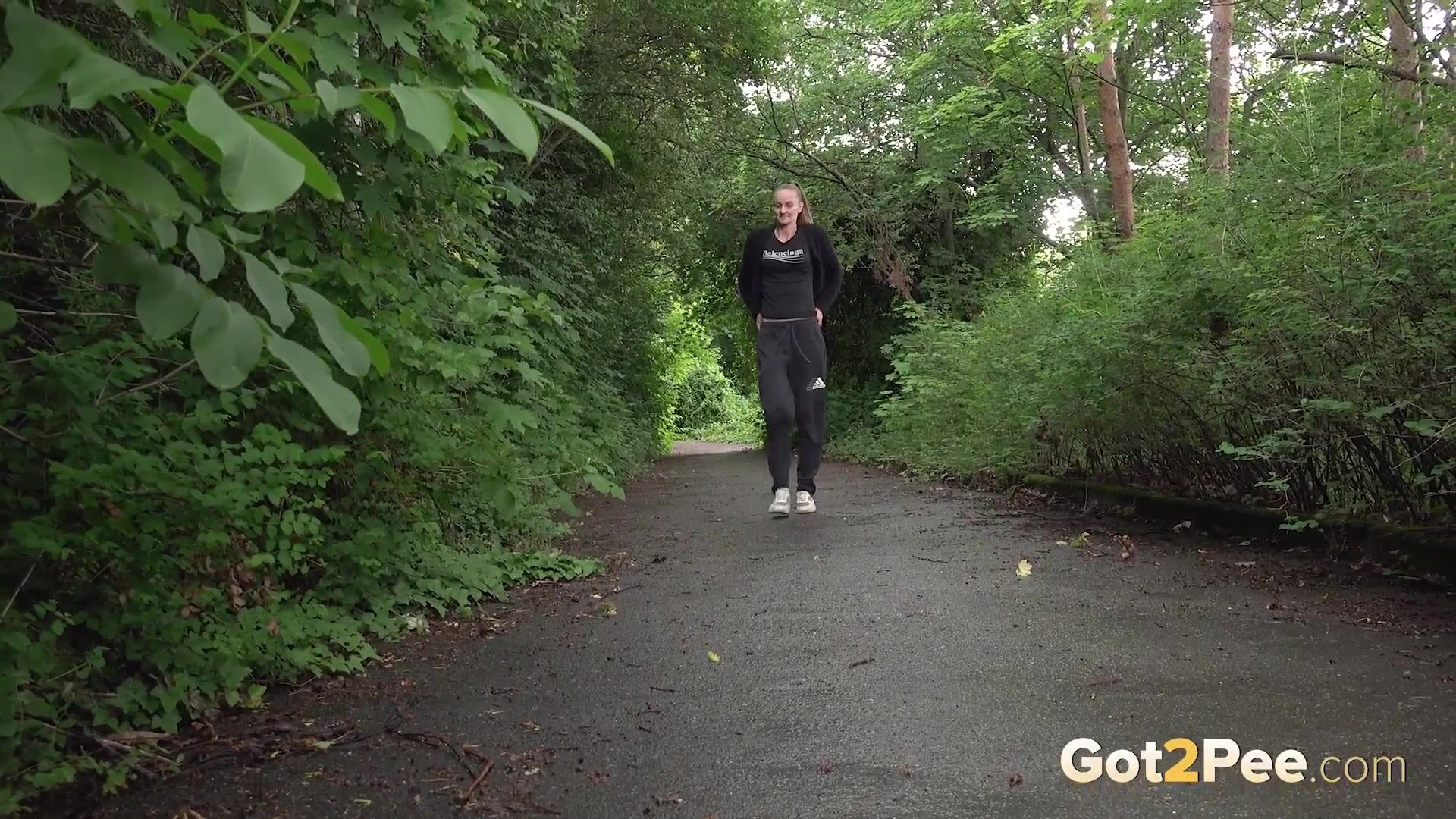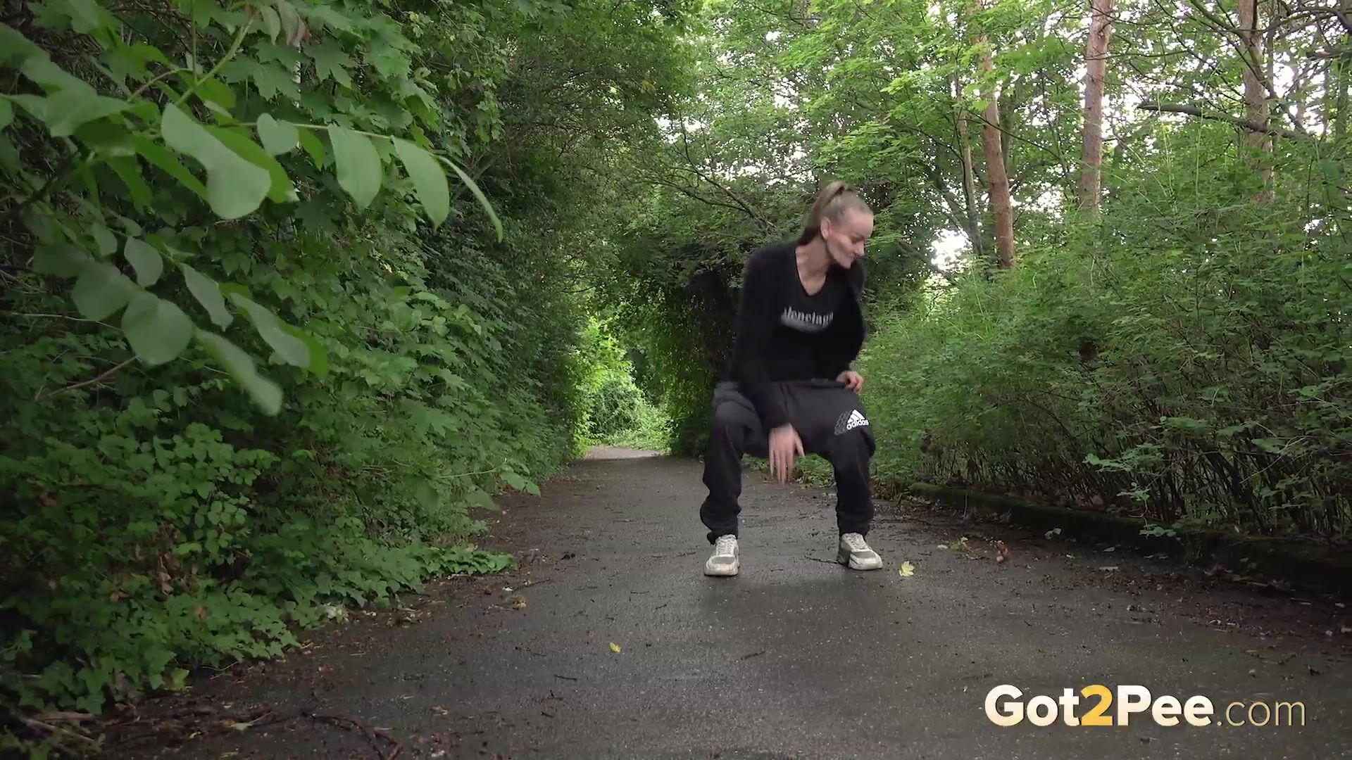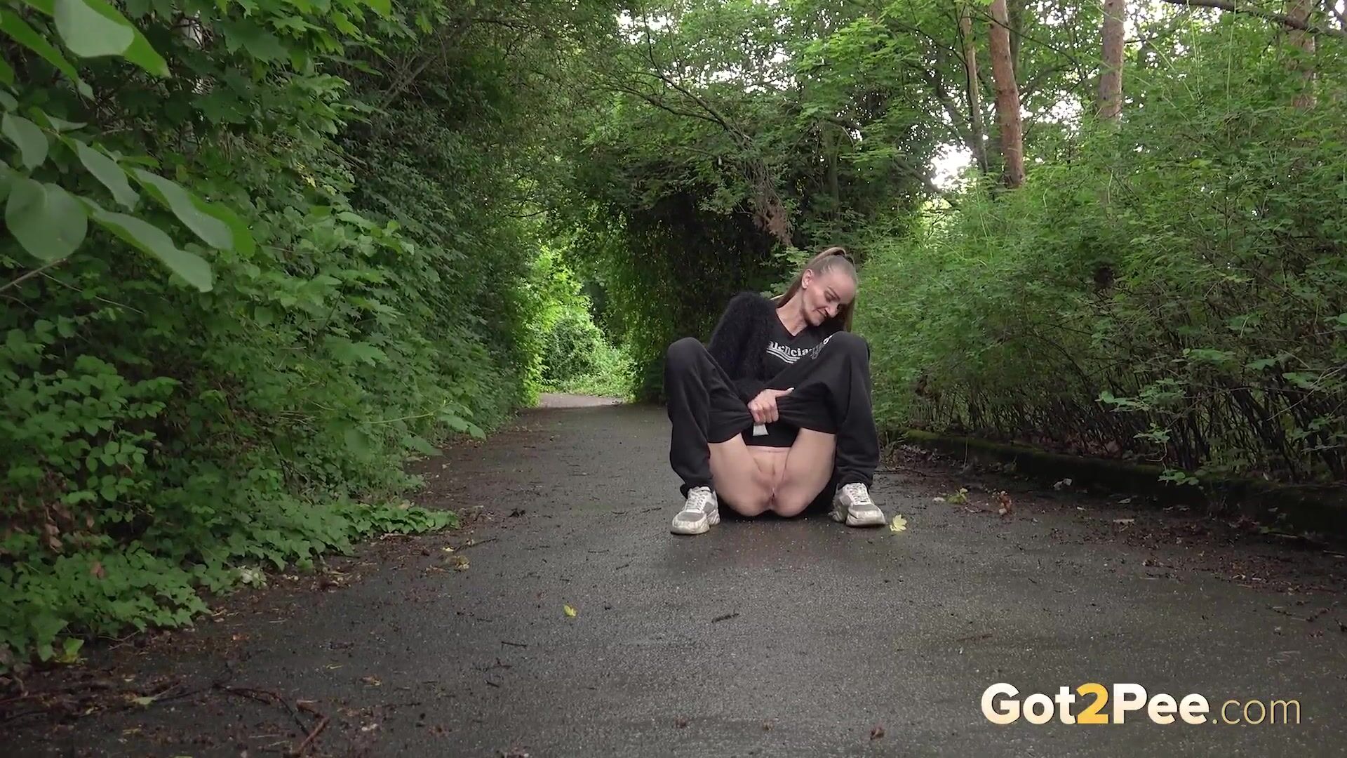 Blonde hottie Sweety features in our newest Got2Pee pissing pornb video. She walks down a country lane wearing jogging bottoms and a long sleeved top. After deciding to relieve her piss desperation, this slim babe squats so close to the ground while letting her juices flow.