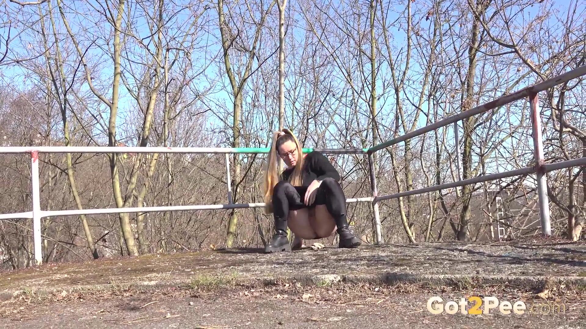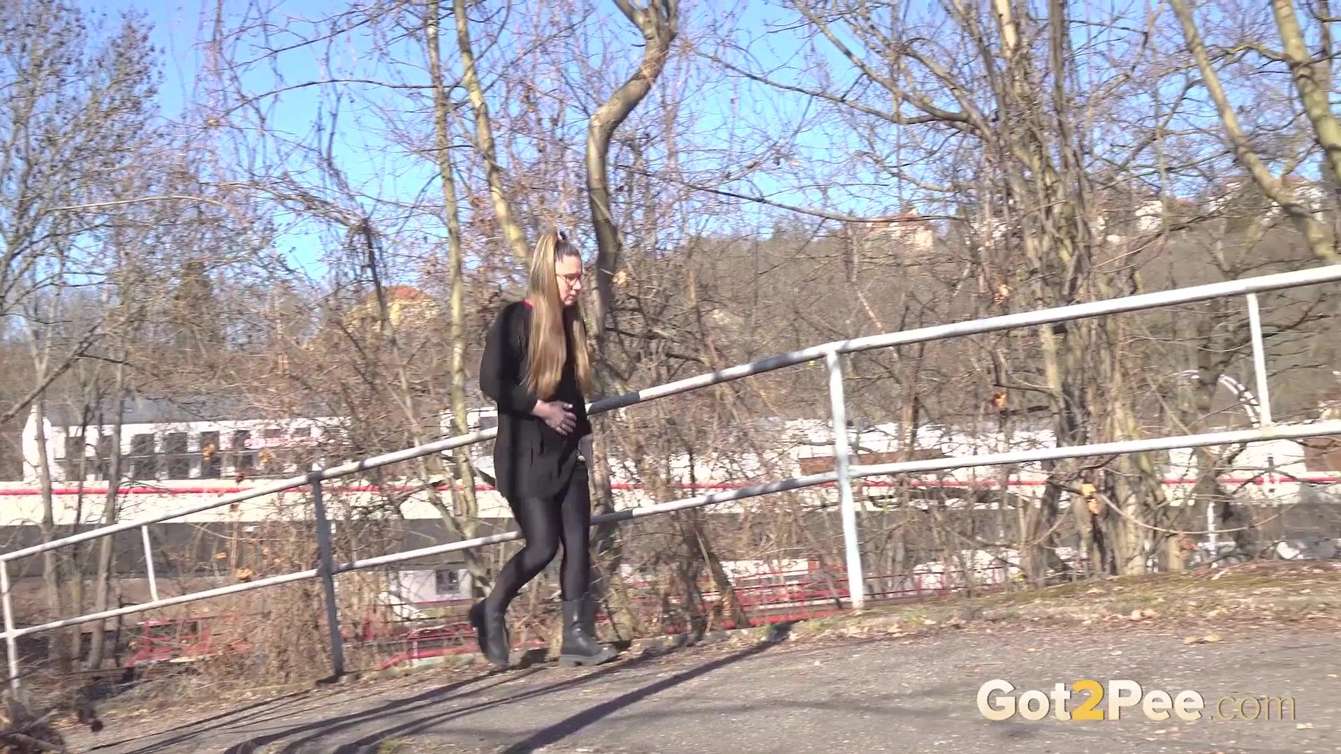 In today's Got2Pee scene, Lara Fox walks along a path in the suburbs. She stops by some railings and pulls down her leggings before squatting to pee. We zoom in close as long haired Lara relieves her piss desperation over the ground in full view of the roads nearby.