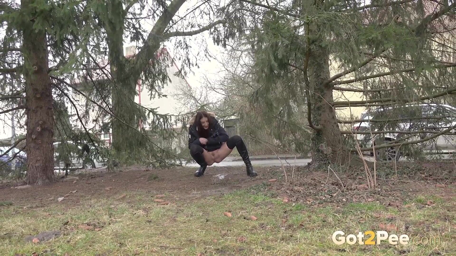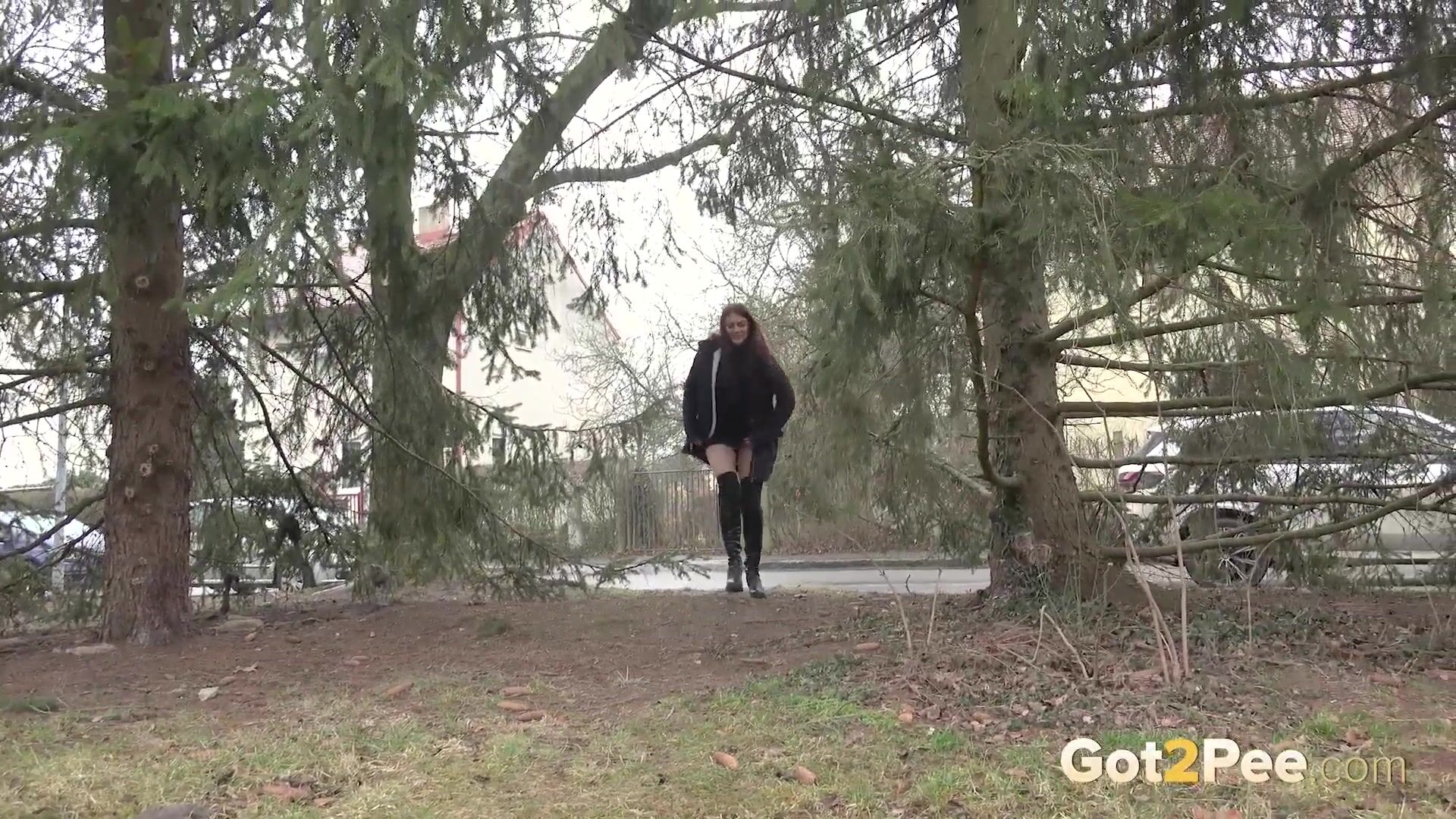 A gorgeous brunette rushes from the road and into some slight tree cover to relieve her piss desperation. She manages to pull up her minidress just in time before squatting to pee as cars drive past her. She really doesn't care from the look of relief across her face!