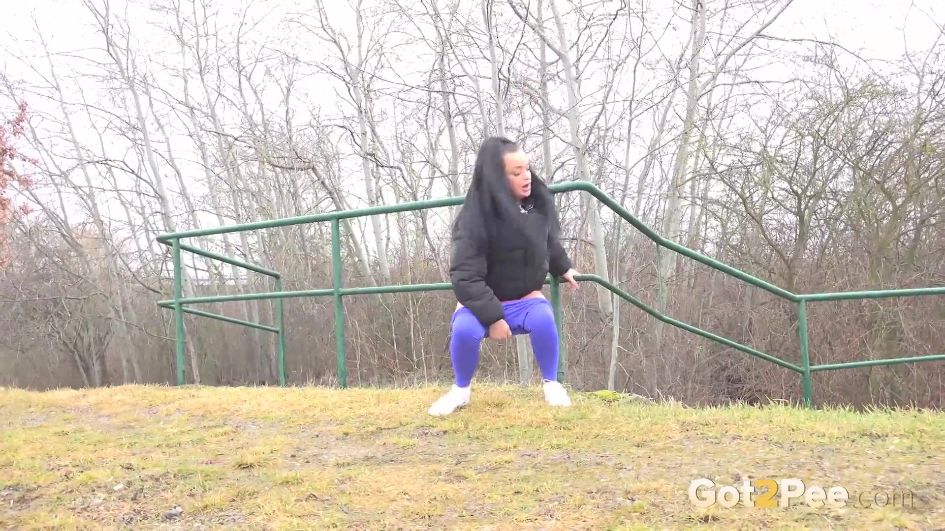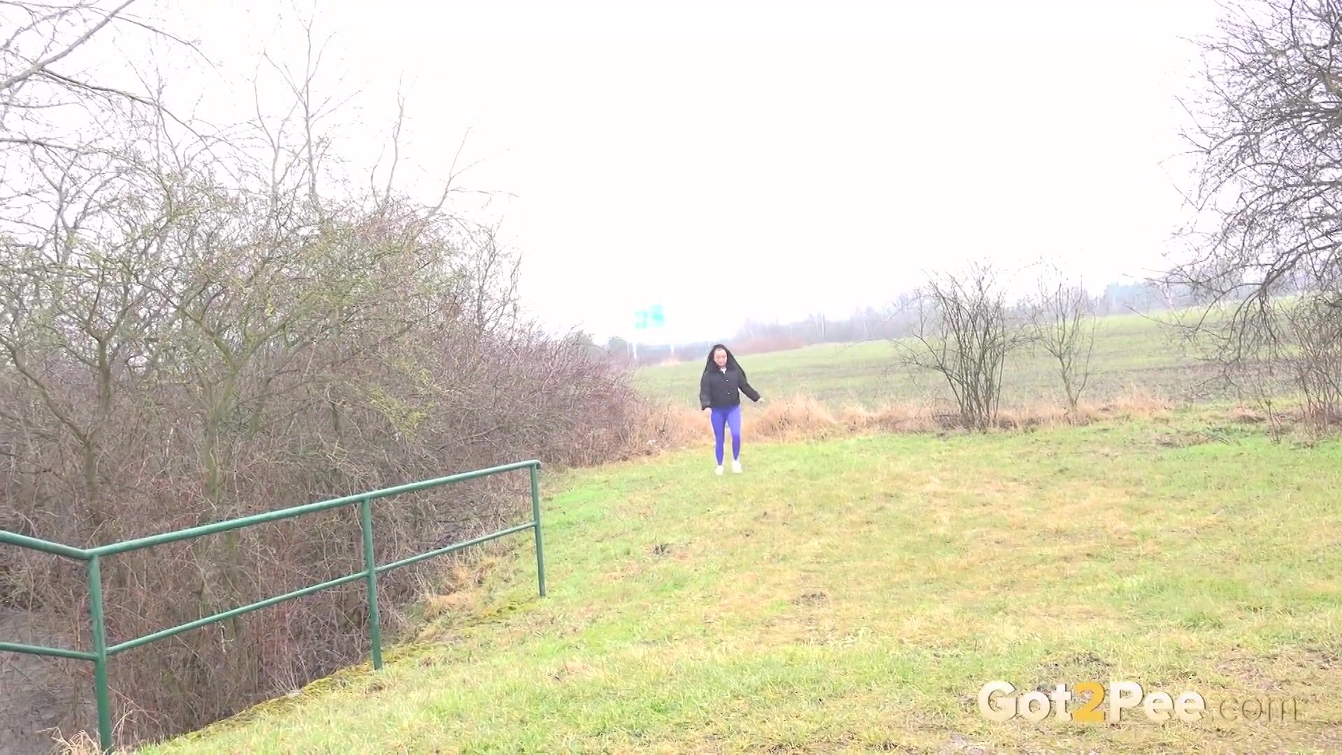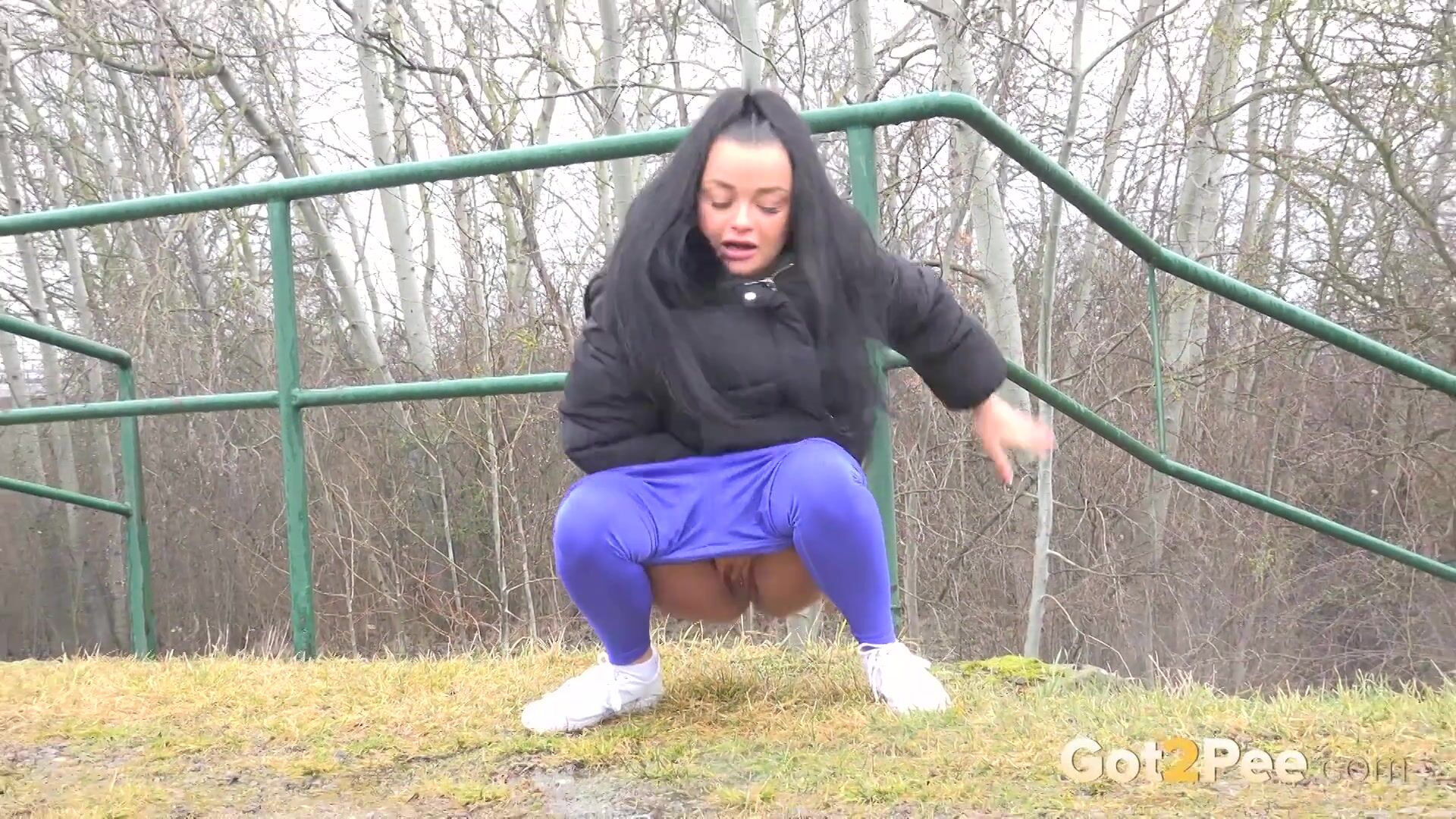 Dark haired Dafne returns to Got2Pee and rushes across a field looking for somewhere to relieve her piss desperation. She stops next to a railing and pulls down her leggings before squatting to pee. She holds onto her pussy while spraying a messy stream of piss down onto the grass beneath her!