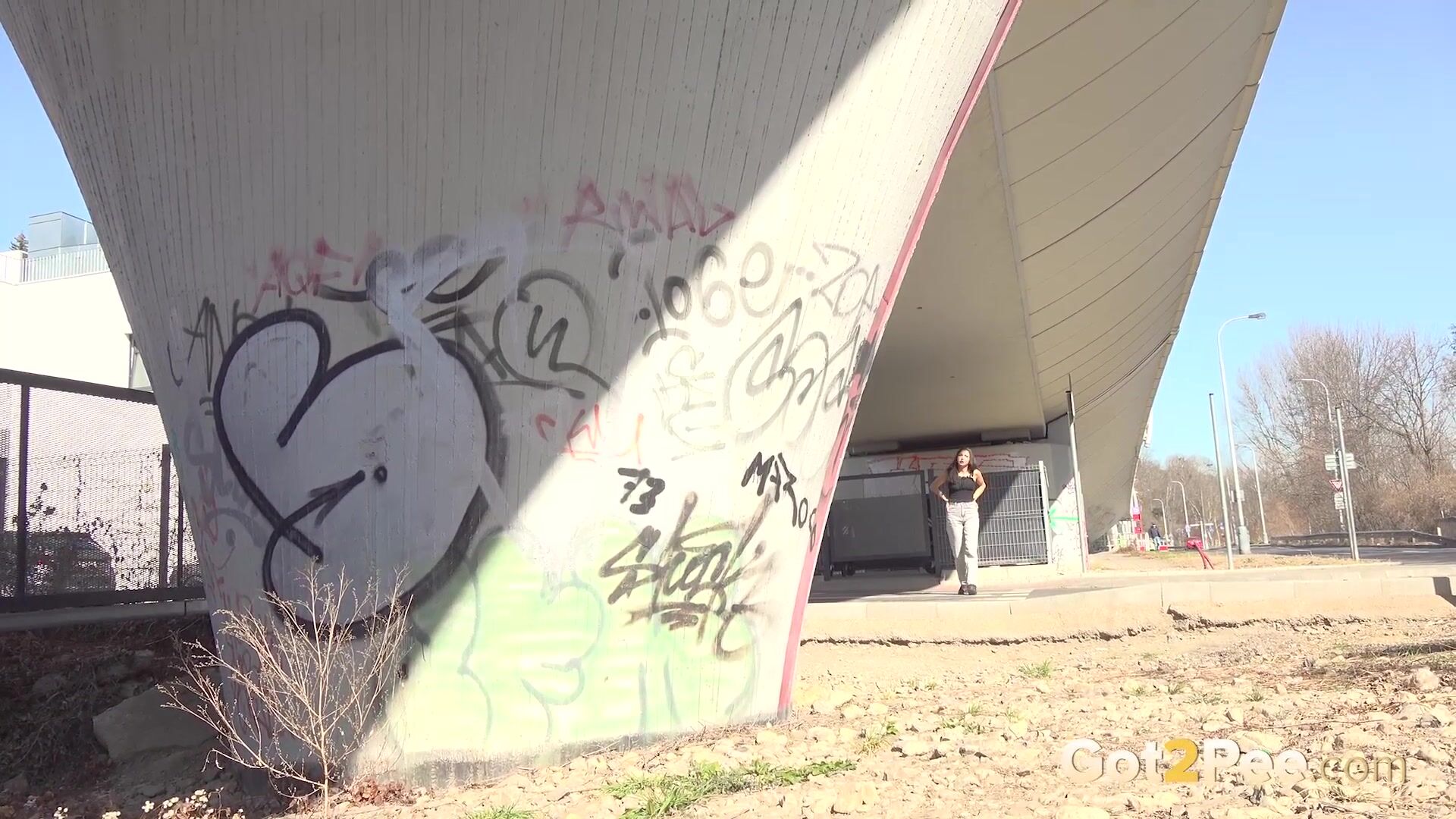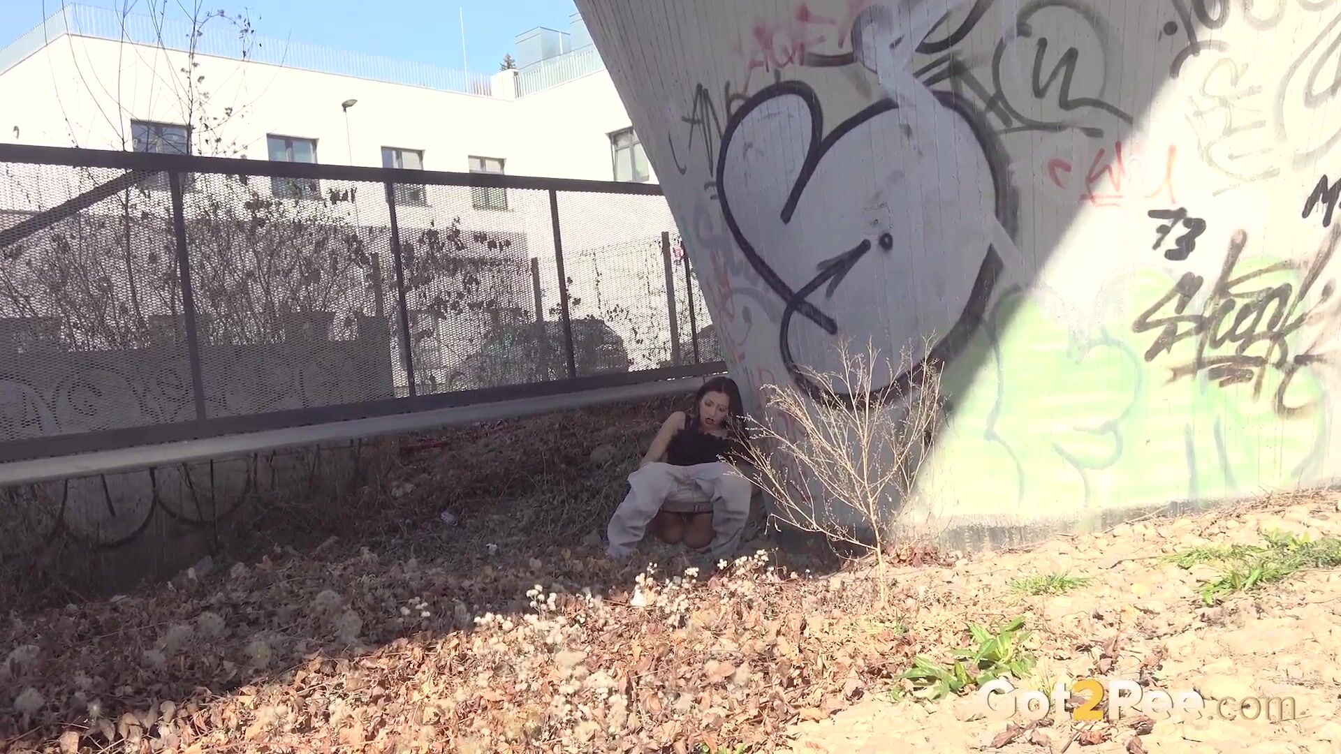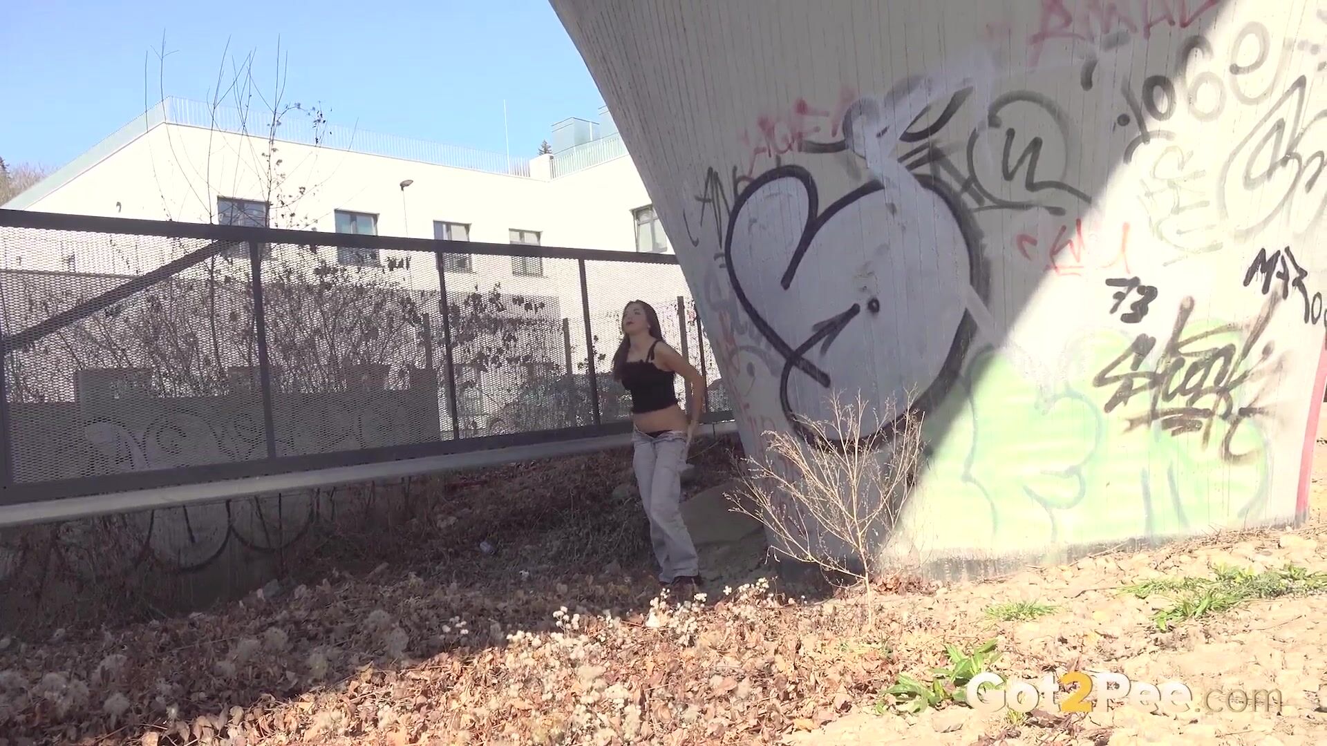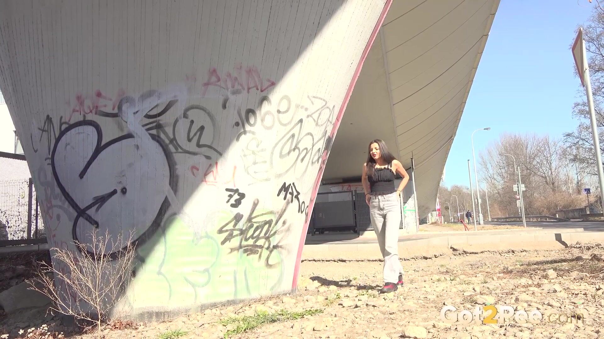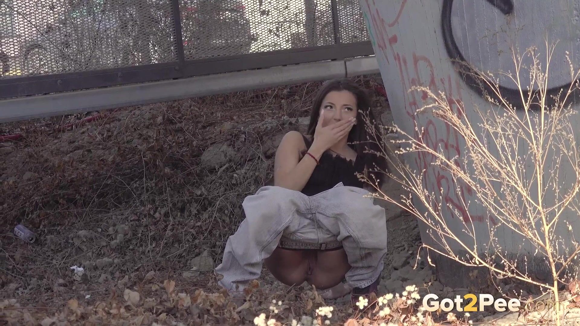 Dark haired hottie Mini Mitzi walks underneath a bridge and stops next to a pillar before pulling down her denims. Squatting to pee, this hottie relieves her piss desperation in the shade while we zoom in and capture all the action for our latest Got2Pee scene!