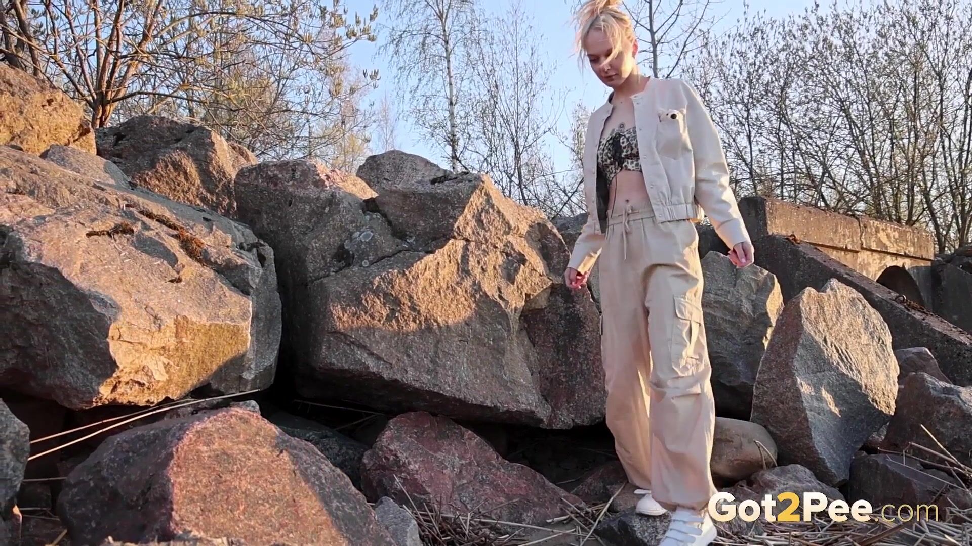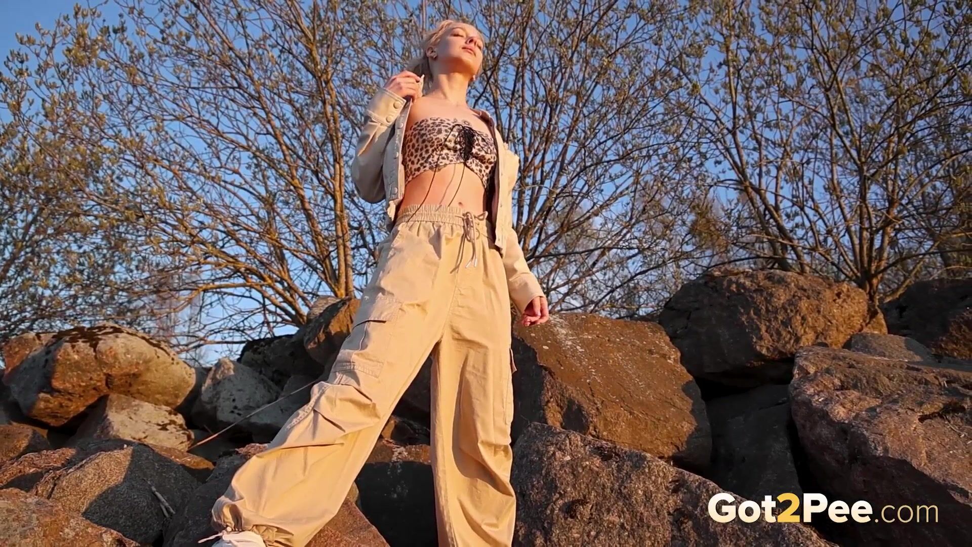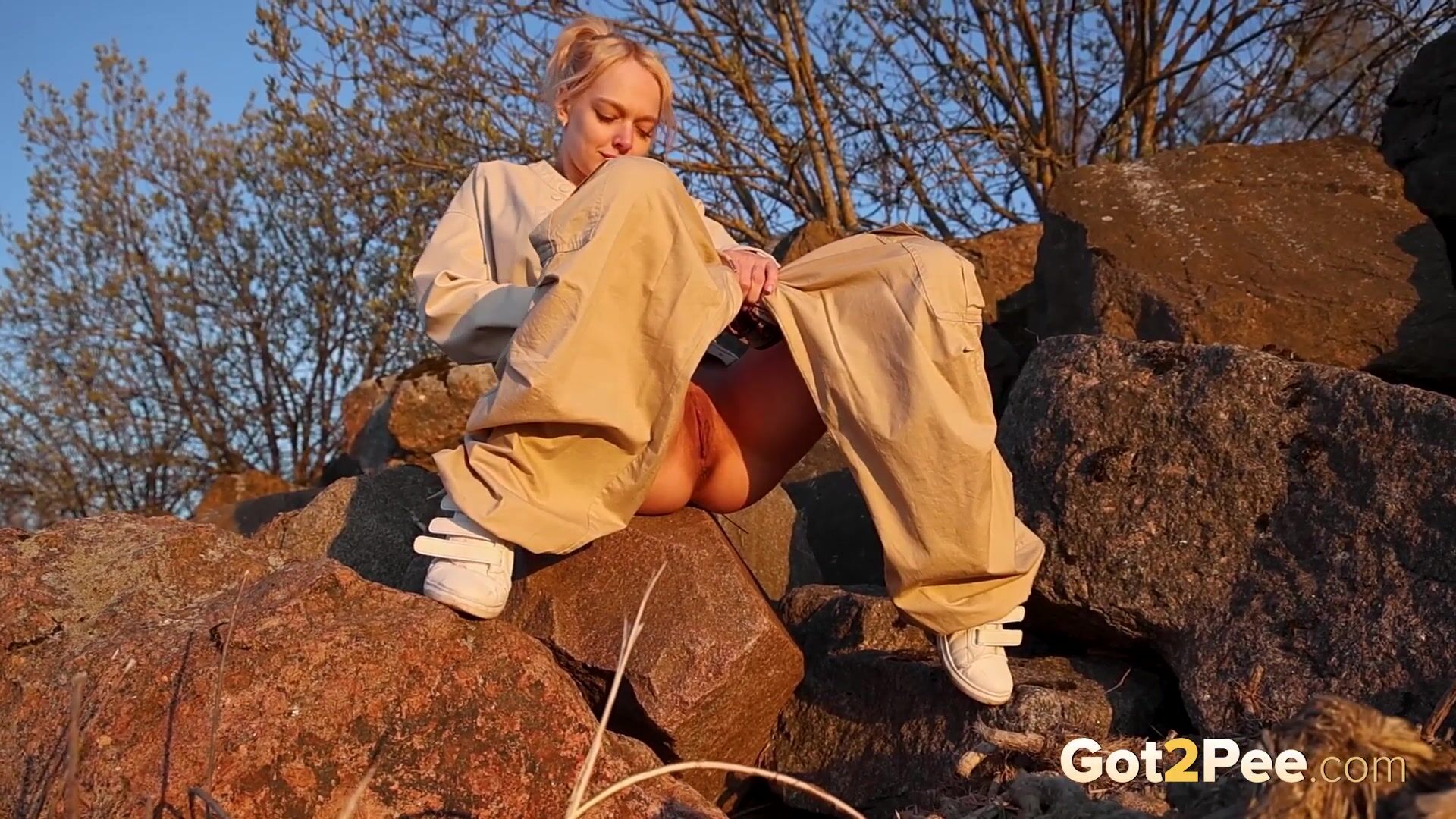Miss Kapriz returns for our newest Got2Pee pissing porn scene and walks carefully over the rocks near the beach. She finds the perfect spot and pulls down her cargo pants before she sits on the edge of a rock and pees. Watch this blonde pissing as she takes her time to enjoy the sensation!