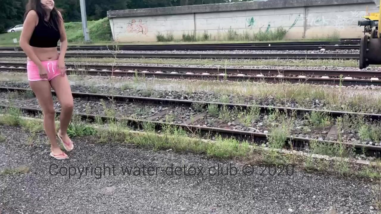 As we were driving to the station, the girls were already screaming how much they needed to go. They jumped out of the car and immediately bent over crossing their legs. The first one couldn't hold more than 5 minutes (and only so long because there was a passer by, she barely managed to let him pass) while the other lost it shortly after...