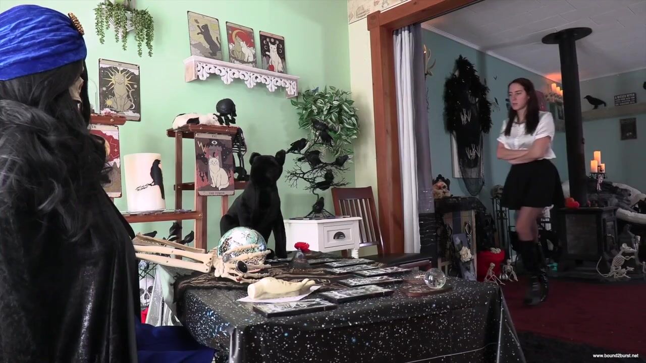 Cadence is working in a seasonal shop for Halloween. He colleague is taking a longer than usual lunch time break, leaving Cadence to watch over the store. Because customers can enter at any time, she is unable to leave the shop unattended, even when she is desperate to pee. She phones her colleague to find out if she can return a little early, but the other girl says no. Cadence has to grit her teeth and hold her full bladder until lunch break is over. She paces up and down and holds herself when no one is in the shop, but does her best to compose herself when someone comes in. She tries several more times to get her colleague to hurry back, and the other girl finally agrees. By the time she returns, Cadence is bursting and makes a dash for the bathroom.