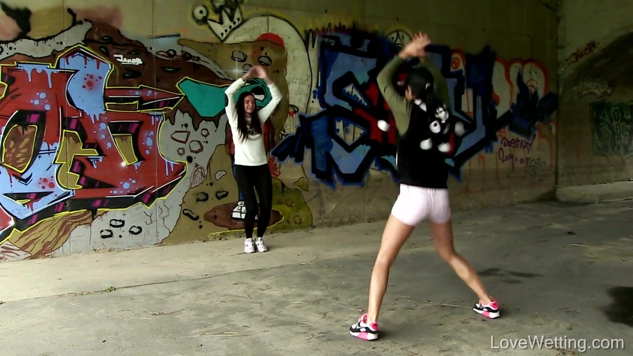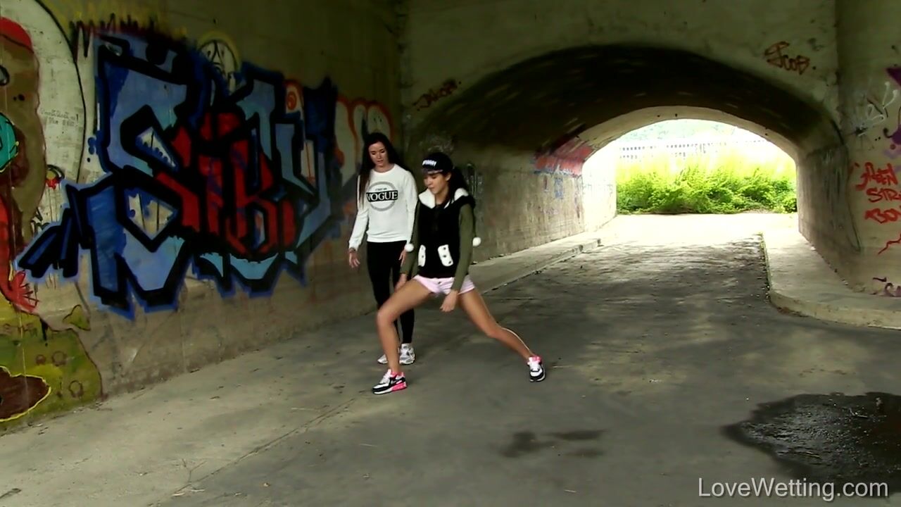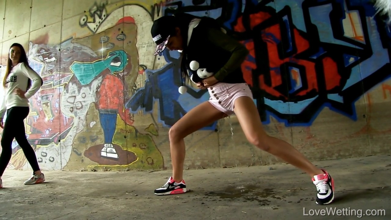 There are videos which have an unexpected early ending and this was the case. Dee drank a lot of ice tea an hour before the shooting and she was supposed to meet her friend near a viaduct and do some excercising. The script suggested about 15 minutes of various excercises and moves which would increase the pressure on Dee's bladder and probably make her release short spurts of pee. Well, Dee was obviously too desperate and at one point (shortly after the start of our filming) simply couldn't hold it anymore. You can see how surprised our assistant was because it took Dee just three minutes before we witnessed the first spurt of pee which was unexpectedly followed by a true waterfall of piss in her shorts. And that was it, the end of our aerobic lesson! :-)