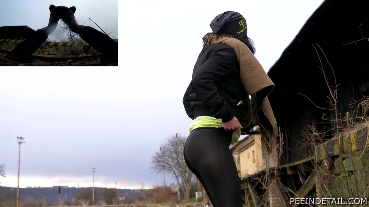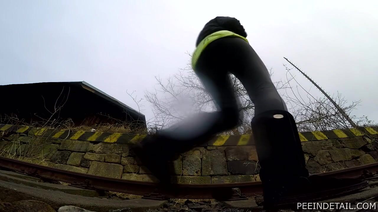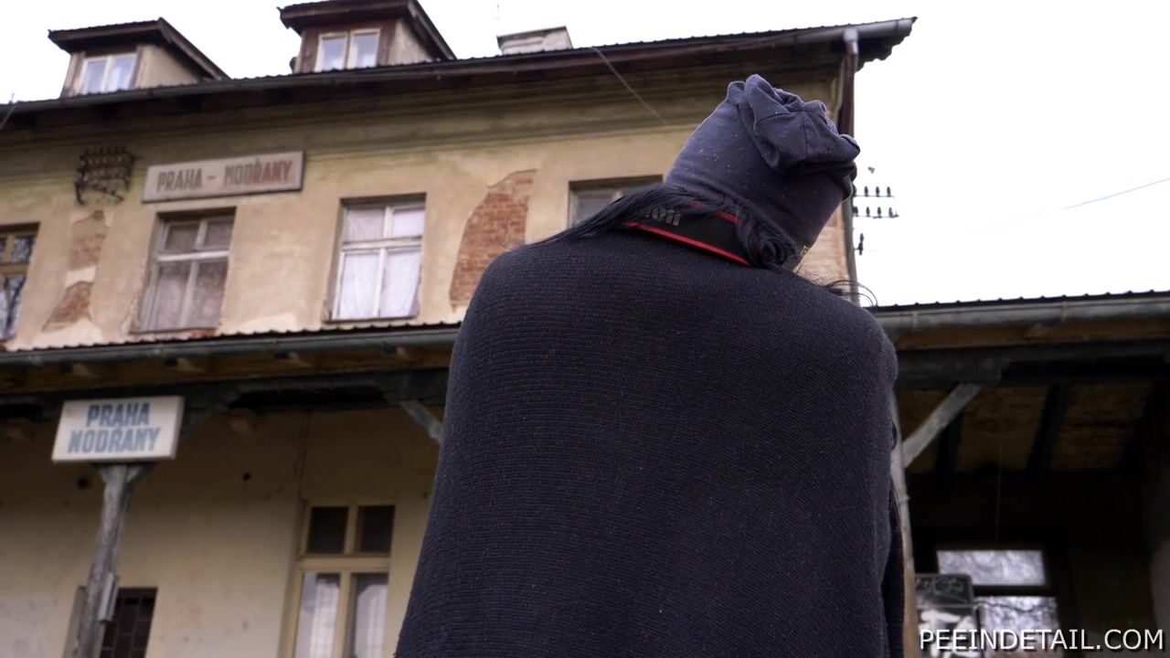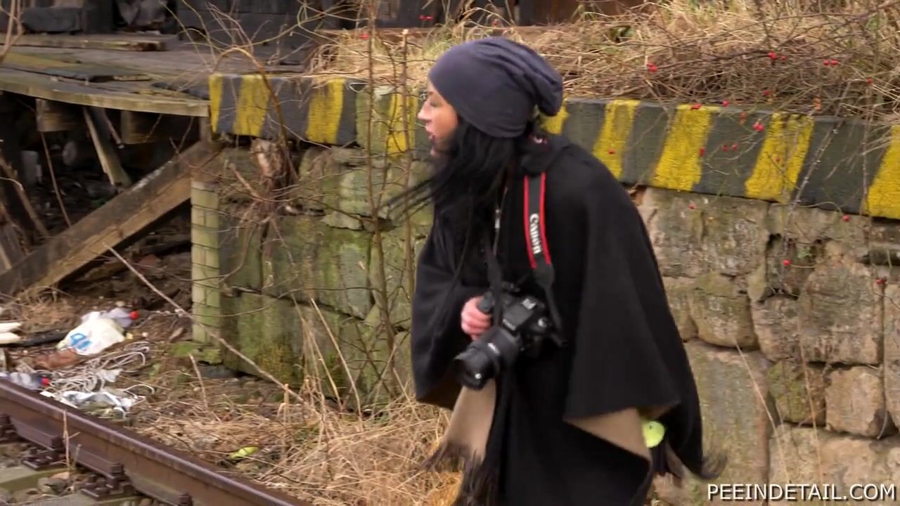 Marcela took her Canon camera and went to an old deserted railroad station to take some art photos of such an interesting place. She's just walking, searching for interesting angles and taking photos of whatever looks interesting to her. She has a can of non-alcoholic beer with her and will have to piss - luckily there are no people there.