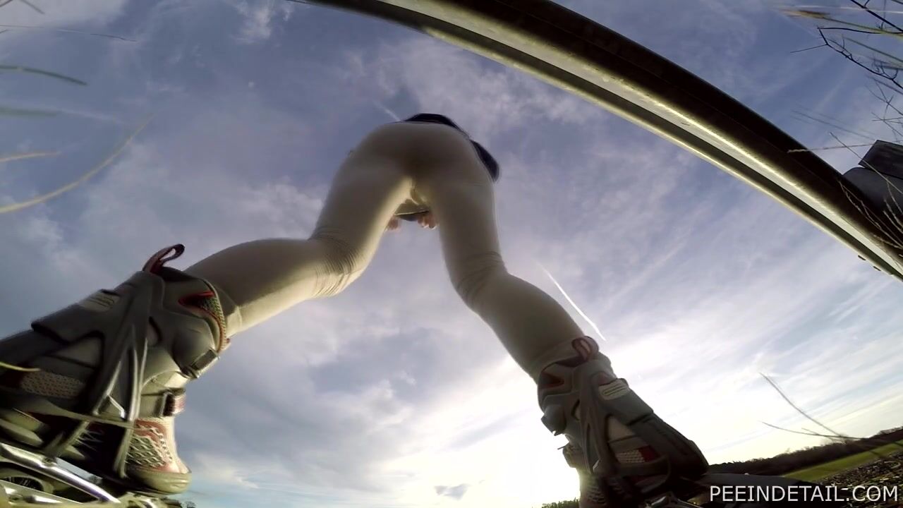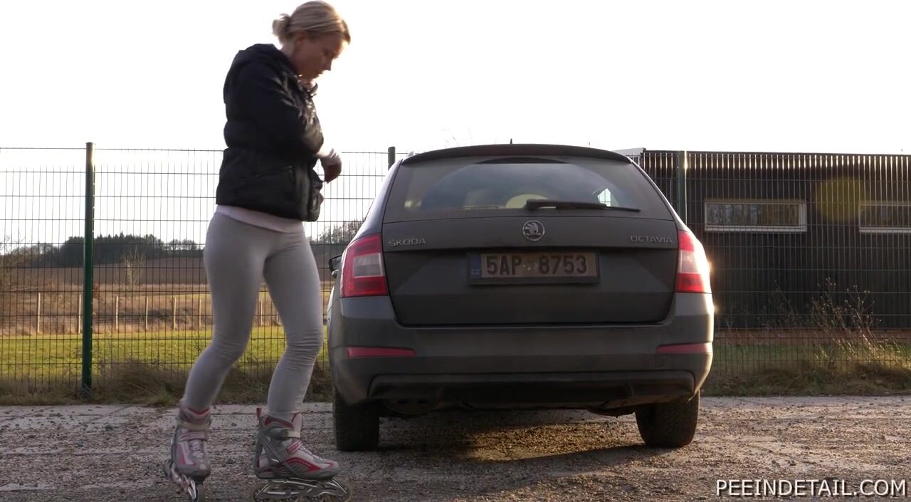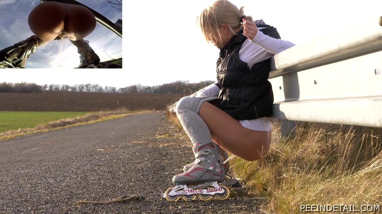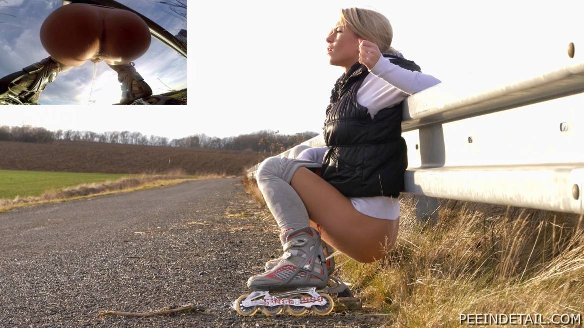 Roller skating is Maja's favorite sport - it keeps her gorgeous body in shape! After half an hour she needs to pee so she finds a deserted spot where nobody is around. Peeing with skates on is quite complicated but luckily the guardrail will provider her the much needed support...