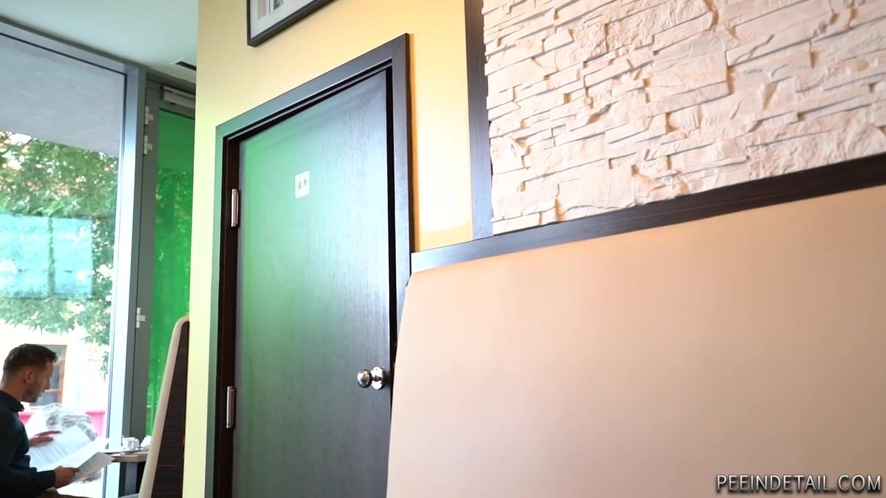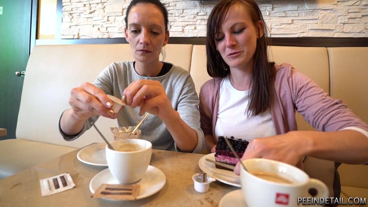 Cafe is the best place to chat with a friend. Laura arrived a bit late today and she didn't have any time to relieve herself at the train station. She knows she will need a toilet break soon and we are here with our cameras to follow her and see what's happening behind the closed door.