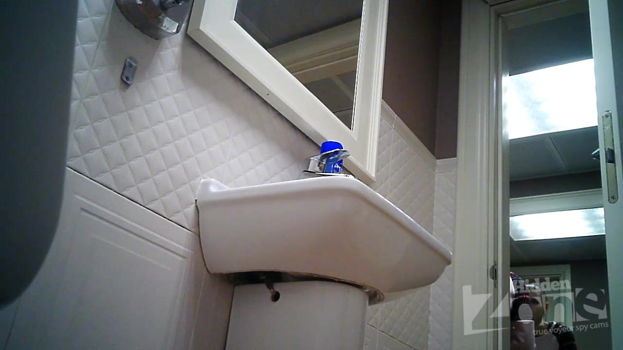 The girl in the purple panties pissed standing. View from one camera. Shaved crotch and anus close-up. A good model for shooting a hidden camera. Hidden camera in the toilet cafe.