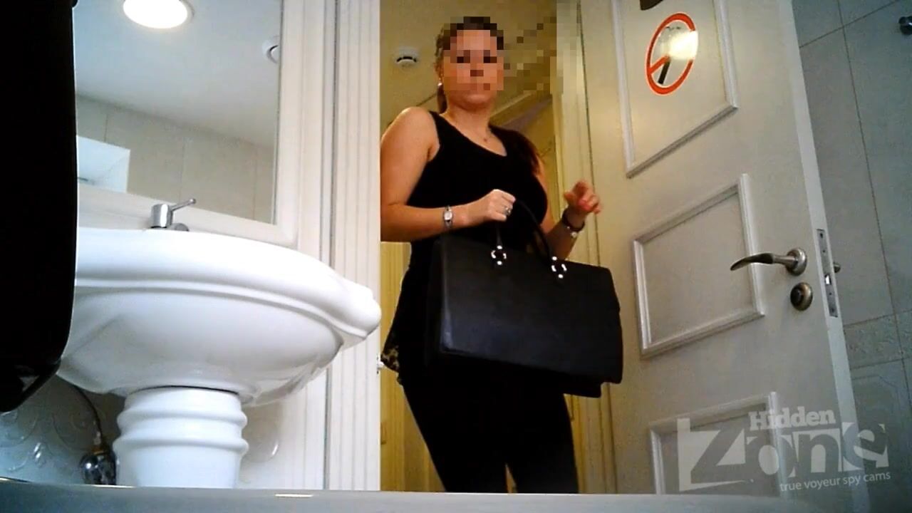 The girl with a posh ass in black panties pissed standing. View from two cameras. Excellent shots from the front camera. Shaved pussy close-up. A good model for filming a hidden camera in the toilet.
