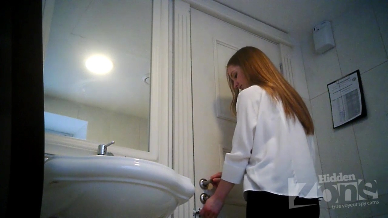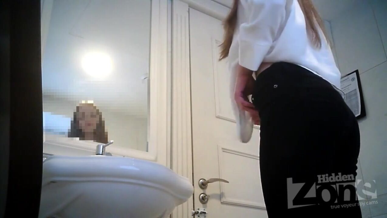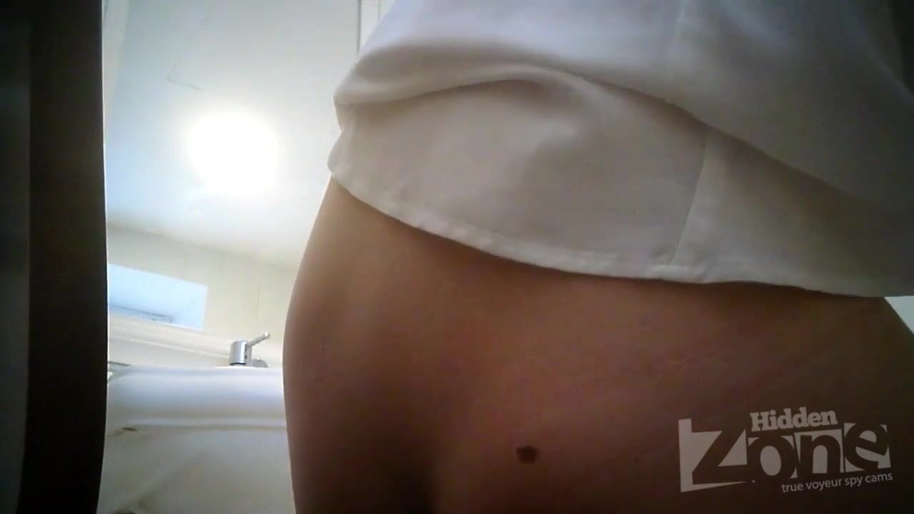 Hidden camera in the women's room. View from one camera. The girl in blue panties pissed while sitting. Our operator photographed on her hidden camera her round ass and shaved crotch.