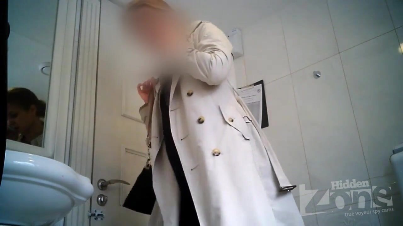 Hidden camera in the toilet. Girl in purple shorts pee standing up. View from two cameras. Good shots from the back hidden camera. Shaved pussy and anus close up.