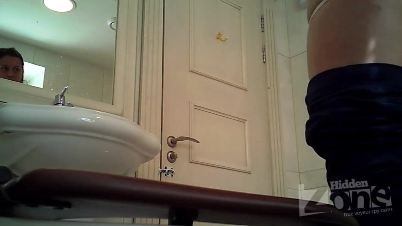 Hidden camera in the toilet cafe. Girl in white panties pee standing up. View from one camera. Shaved crotch and anus close up. A good model for filming a hidden camera.